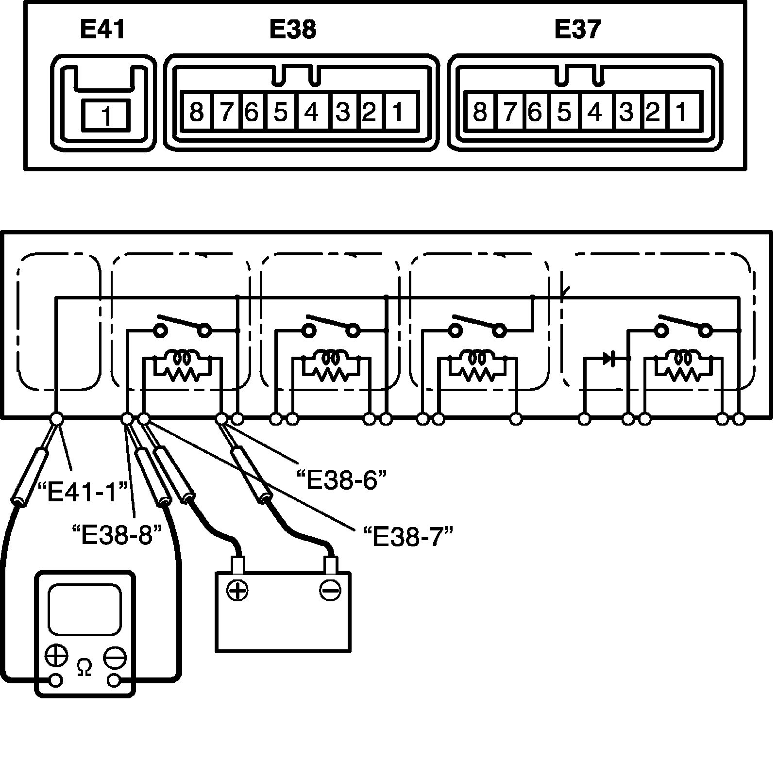 4) Connect battery positive (+) terminal to terminal "E38-6" of relay. Connect battery negative (-) terminal to terminal "E38-7" of relay. Check for continuity between terminal "E41-1" and "E38-8". If there is no continuity when relay is connected to the battery, replace power integration relay No.2.