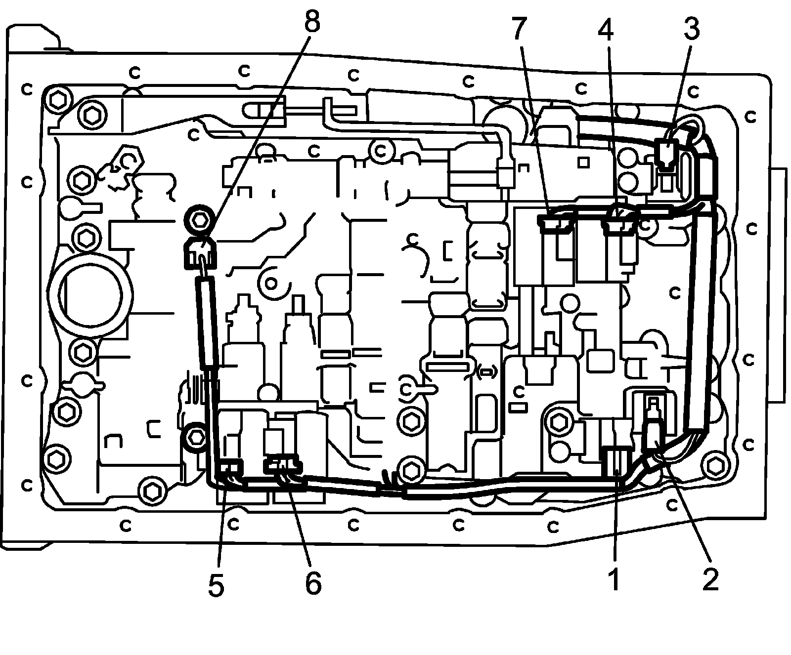 3) Disconnect shift solenoid-A connector (1), shift solenoid-B connector (2), shift solenoid-E connector (3), TCC pressure control solenoid connector (4), pressure control solenoid-A connector (5), pressure control solenoid-B connector (6) and pressure control solenoid-C connector (7).
