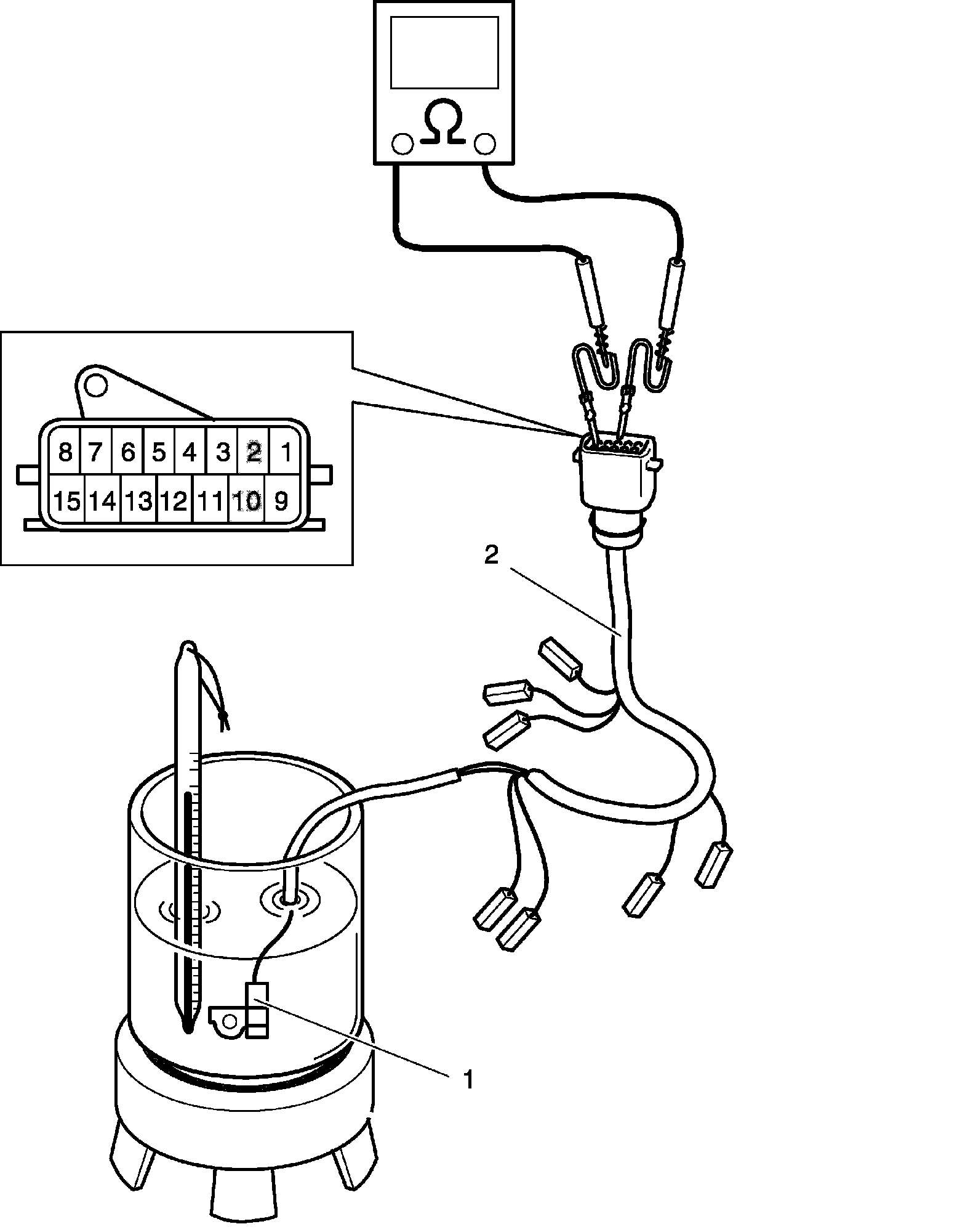 Transmission Fluid Temperature Sensor InspectionImmerse transmission fluid temperature sensor (1) in water or oil. Check transmission fluid temperature sensor resistance between terminals of connector. Thus make sure its resistance decreases as temperature rises.