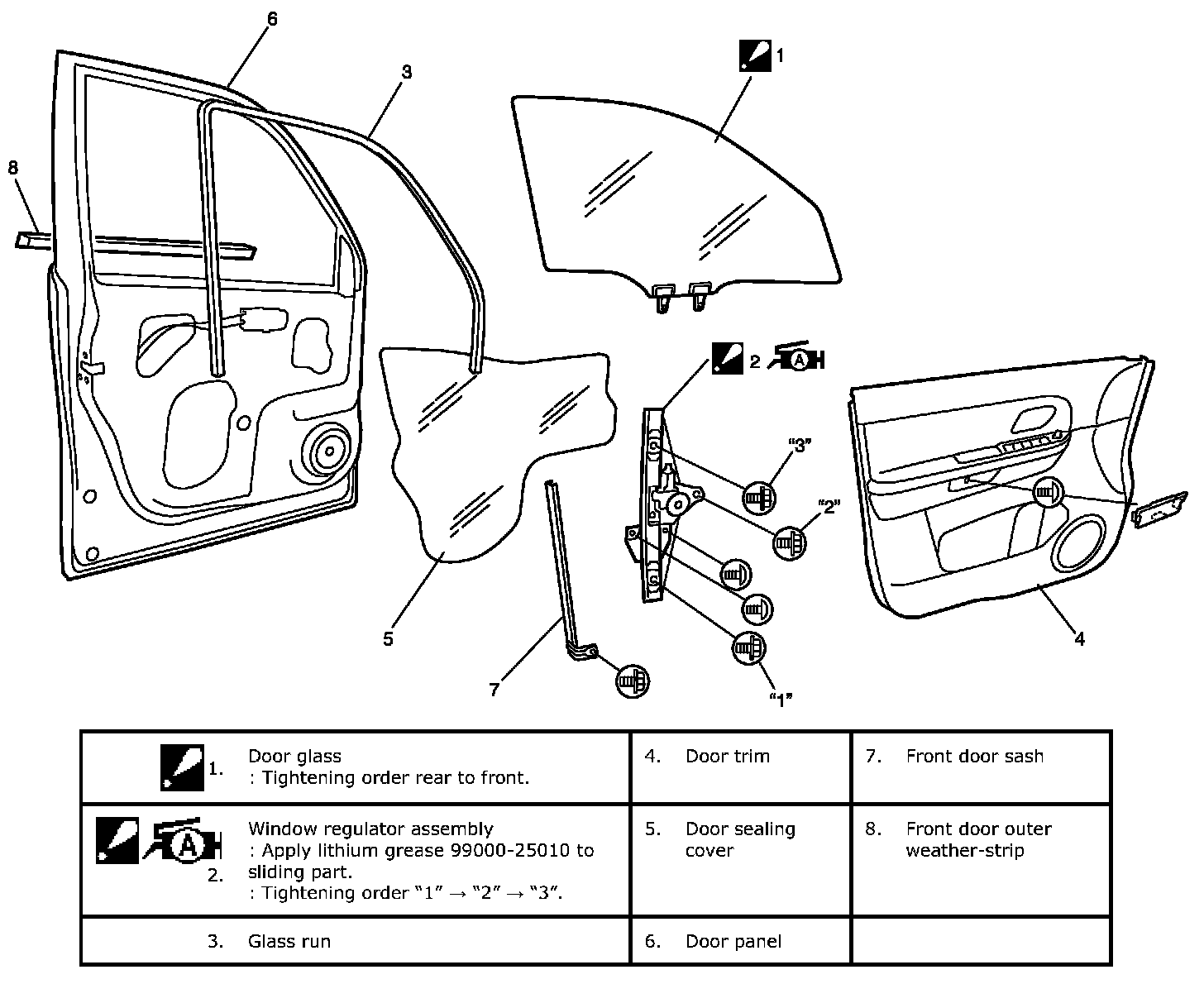 1. Remove door glass referring to Front Door Glass Removal and Installation.