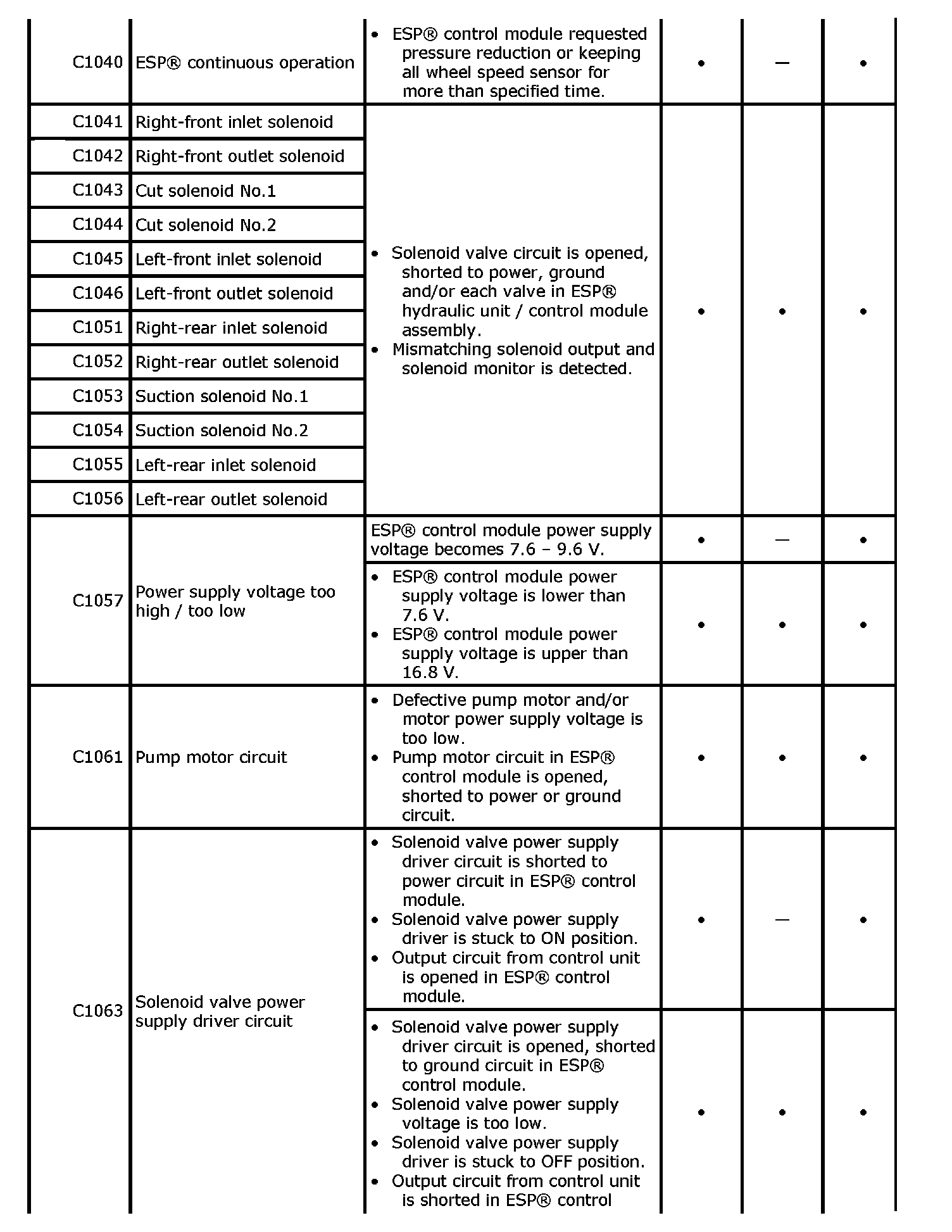^ "-" in ABS warning light, EBD warning light and ESP(R) warning light column of the above table means warning light is lit when DTC is detected.