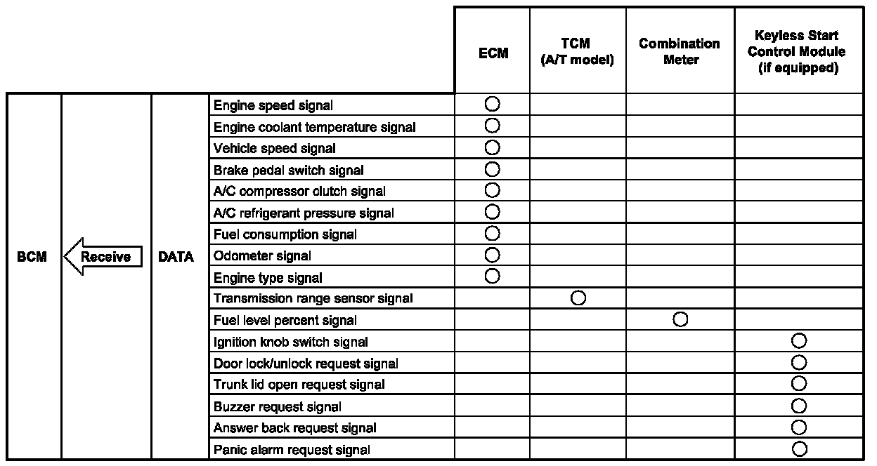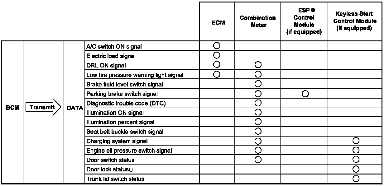 Refer to CAN Communication System Description CAN Communication System Description for CAN communication system description. BCM communication control data with each control module as follows.