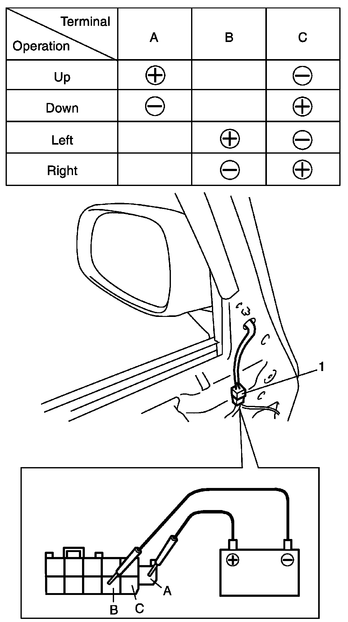 4. Connect battery positive (+) and negative (-) terminal to the door mirror terminals as shown.