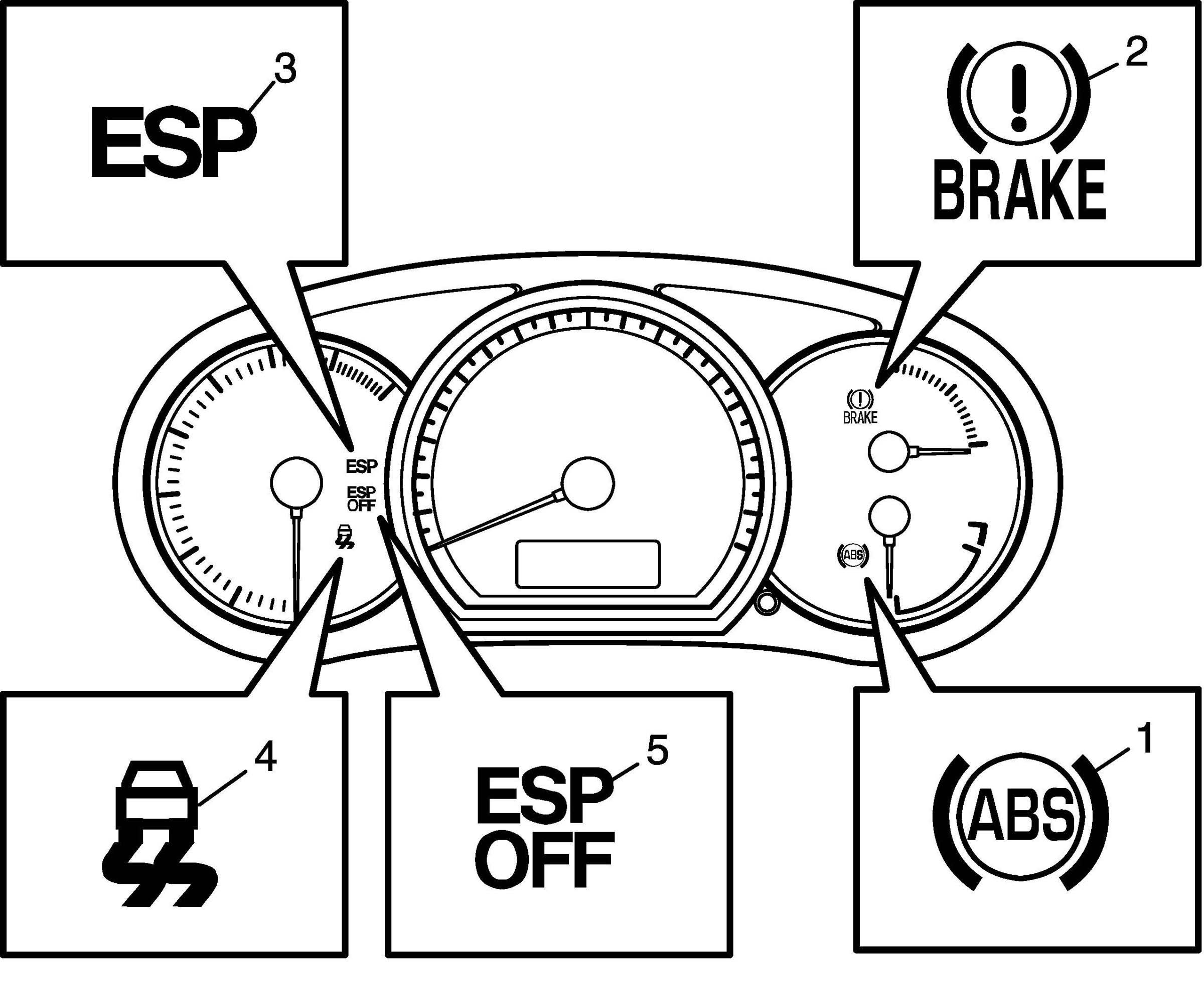 ESP(R) control module monitors each input and output signals. When ESP(R) control module detects any malfunction, some of ABS warning light (1), EBD warning light (brake warning light) (2), ESP(R) warning light (3), SLIP indicator light (4), ESP(R) OFF light (5) are turned ON and indicate the abnormality to driver.
