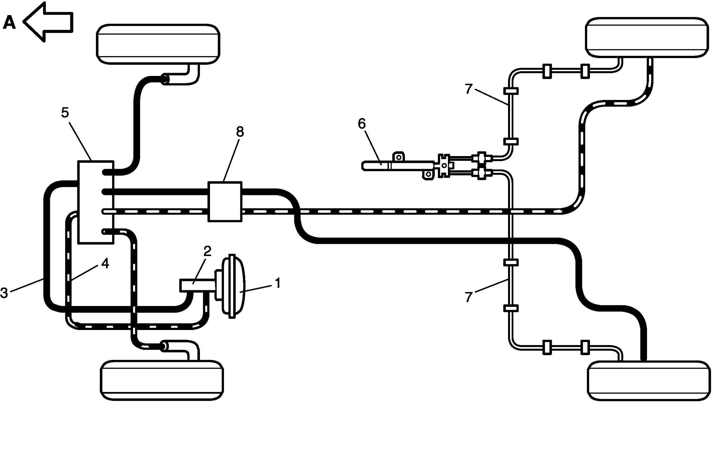 Brakes ConstructionWhen the foot brake pedal is depressed, hydraulic pressure is developed in the master cylinder to actuate pistons (two in front and four in rear).