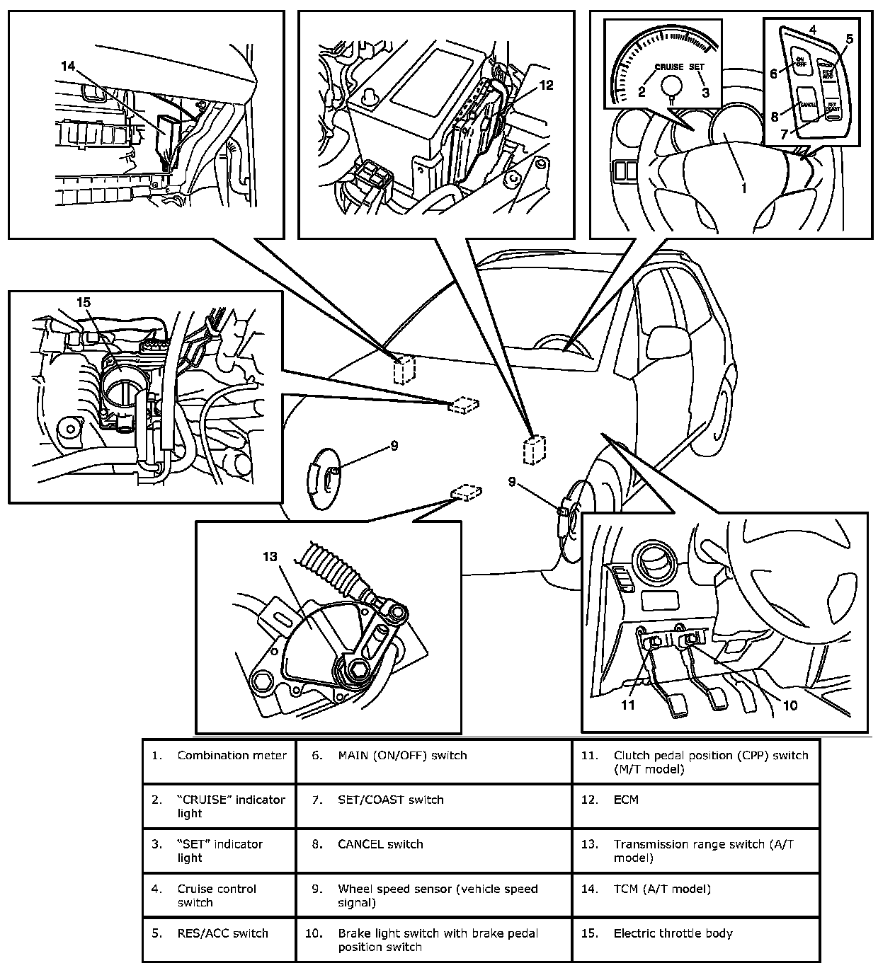 Cruise Control System ConstructionThe cruise control system is a device which maintains a preset vehicle speed while driving at a high speed, e.g., on a highway. It allows the driver to drive his vehicle at a constant speed of 40 km/h (25 mile/h) or higher without depressing the accelerator pedal. The system also has such functions as to change the vehicle speed without operating the accelerator pedal (but using SET/COAST and RES/ACC switches), cancel cruise control (CANCEL switch) and resume the speed in memory automatically after cruise control is cancelled (RES/ACC switch). The system mainly consists of electric throttle body assembly, ECM, cruise control switch (MAIN (ON/OFF) switch, SET/COAST switch, RES/ACC switch and CANCEL switch), etc.