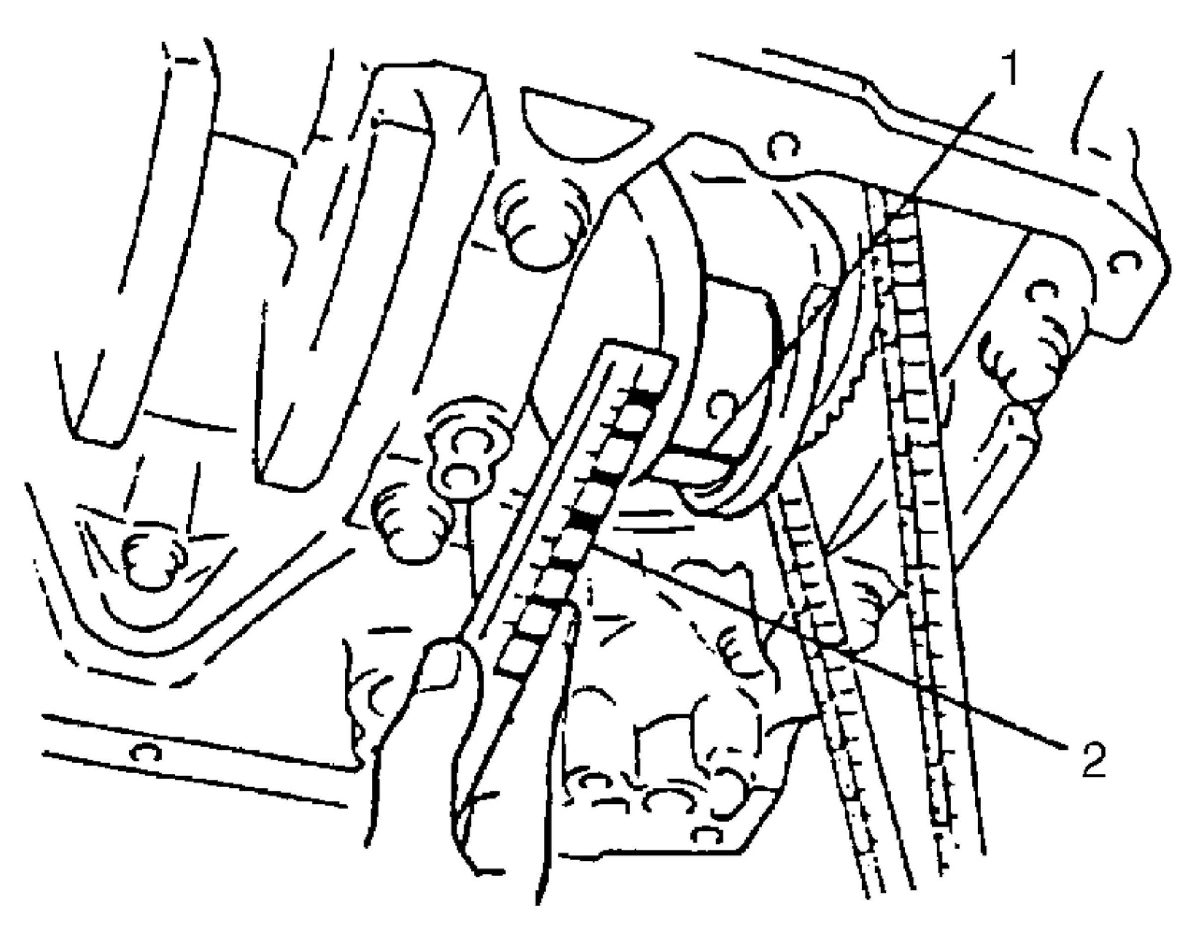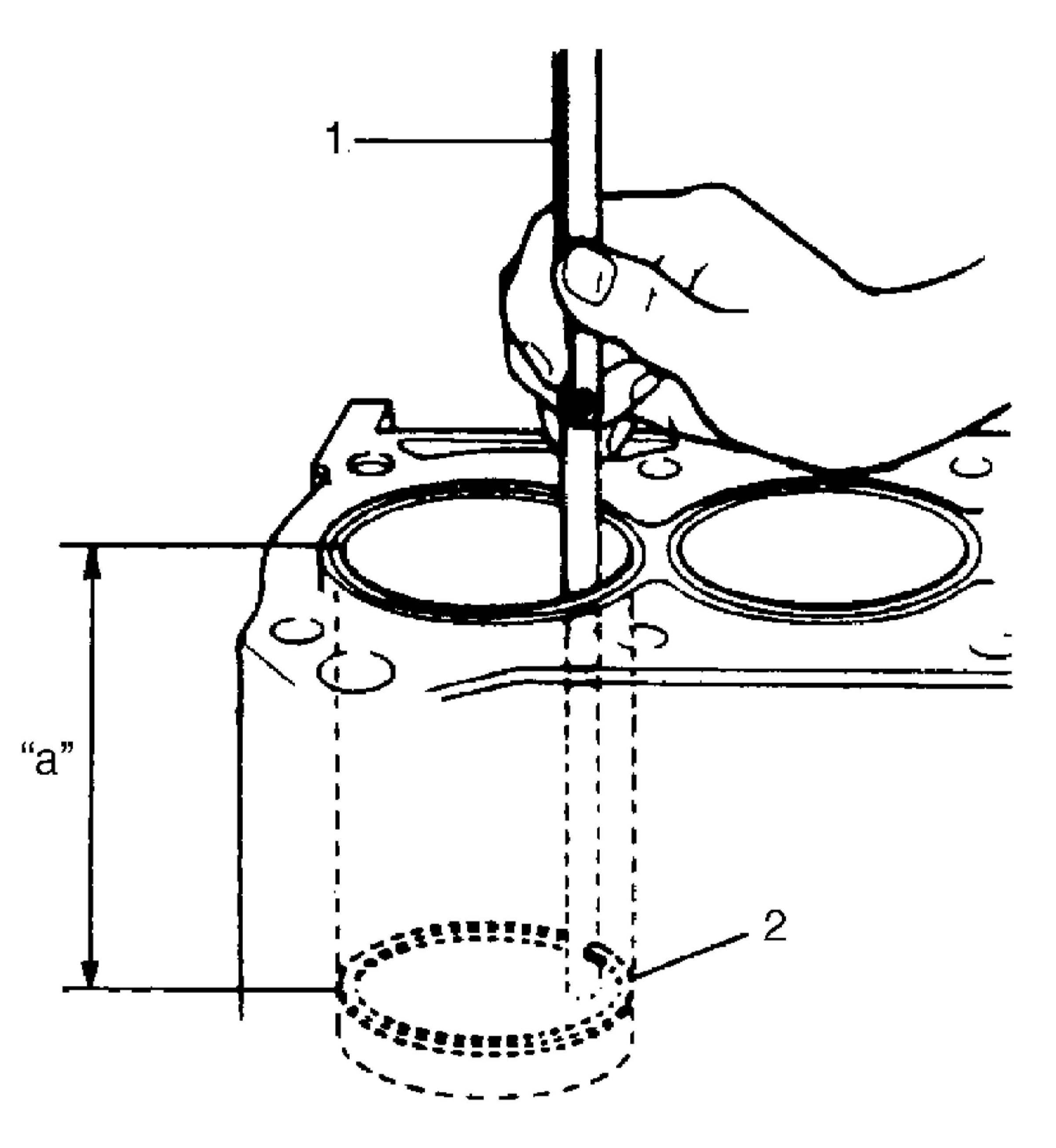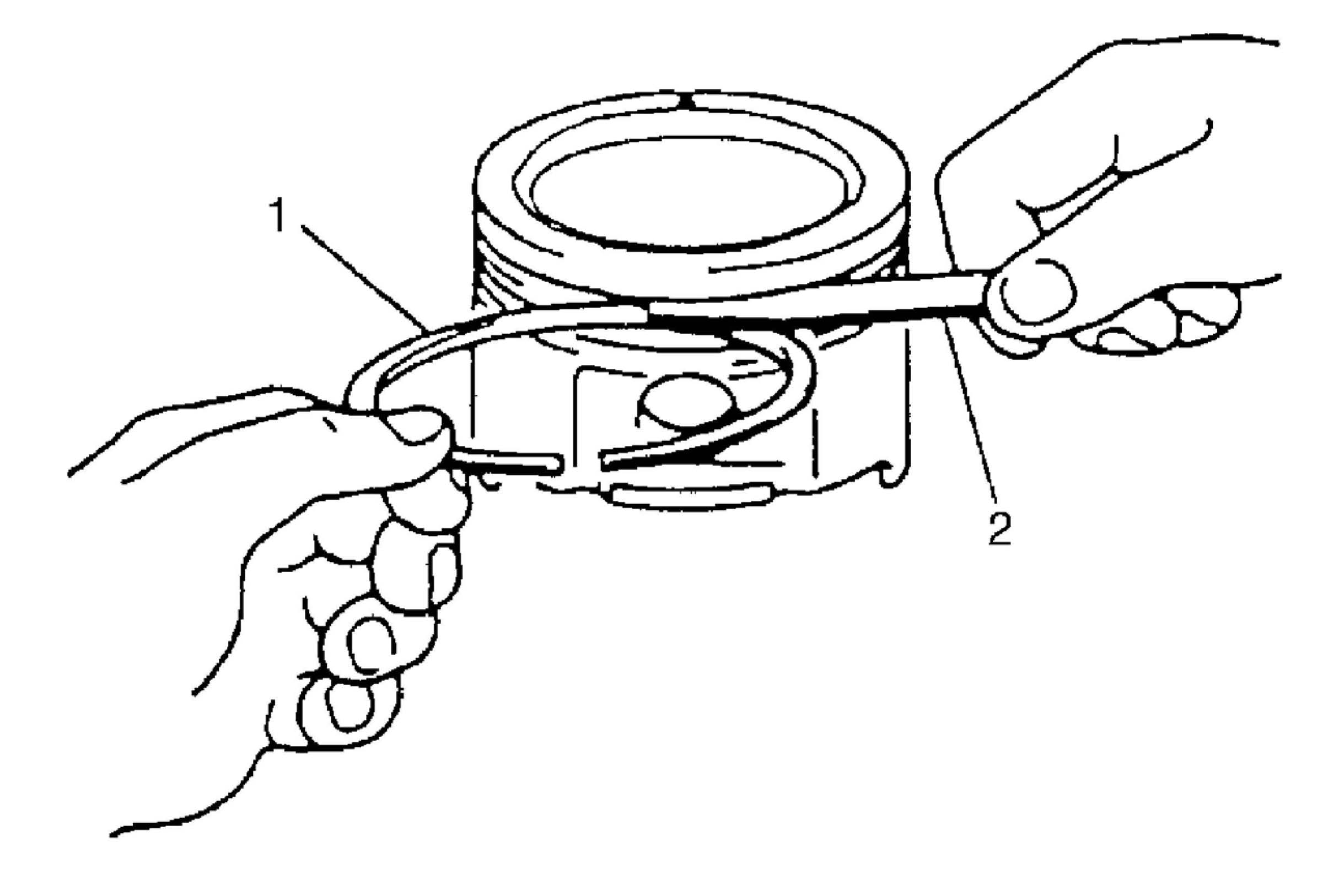 To measure end gap, insert piston ring (2) into cylinder bore and then measure the gap by using thickness gauge (1). If measured gap is out of specification, replace ring.