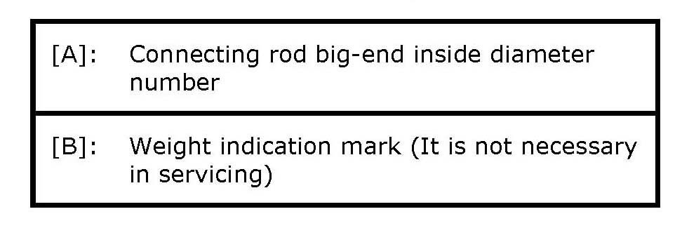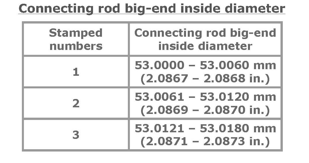 Three kinds of numbers ("1", "2" and "3") represent the following connecting rod big end inside diameters. For example, stamped number "1" indicates that corresponding connecting rod big-end inside diameter is 53.0000 - 53.0060 mm (2.0867 - 2.0868 in.).