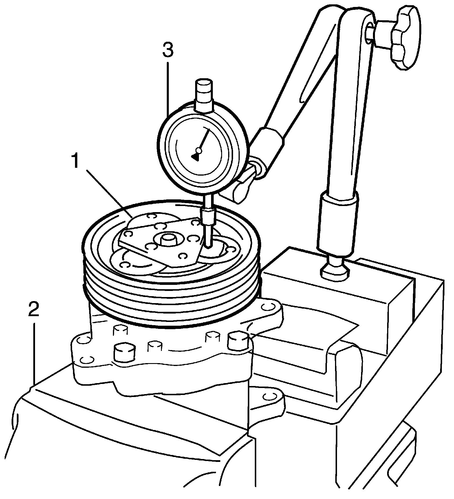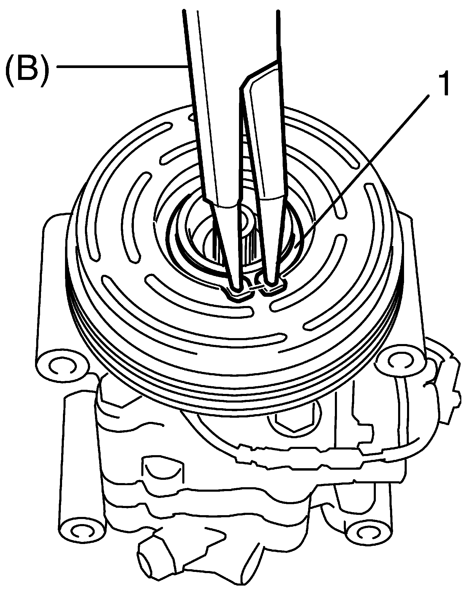 7. Adjust clearance between armature plate (1) and magnet clutch pulley by putting shim(s) on compressor shaft. To measure the clearance, perform the following steps.