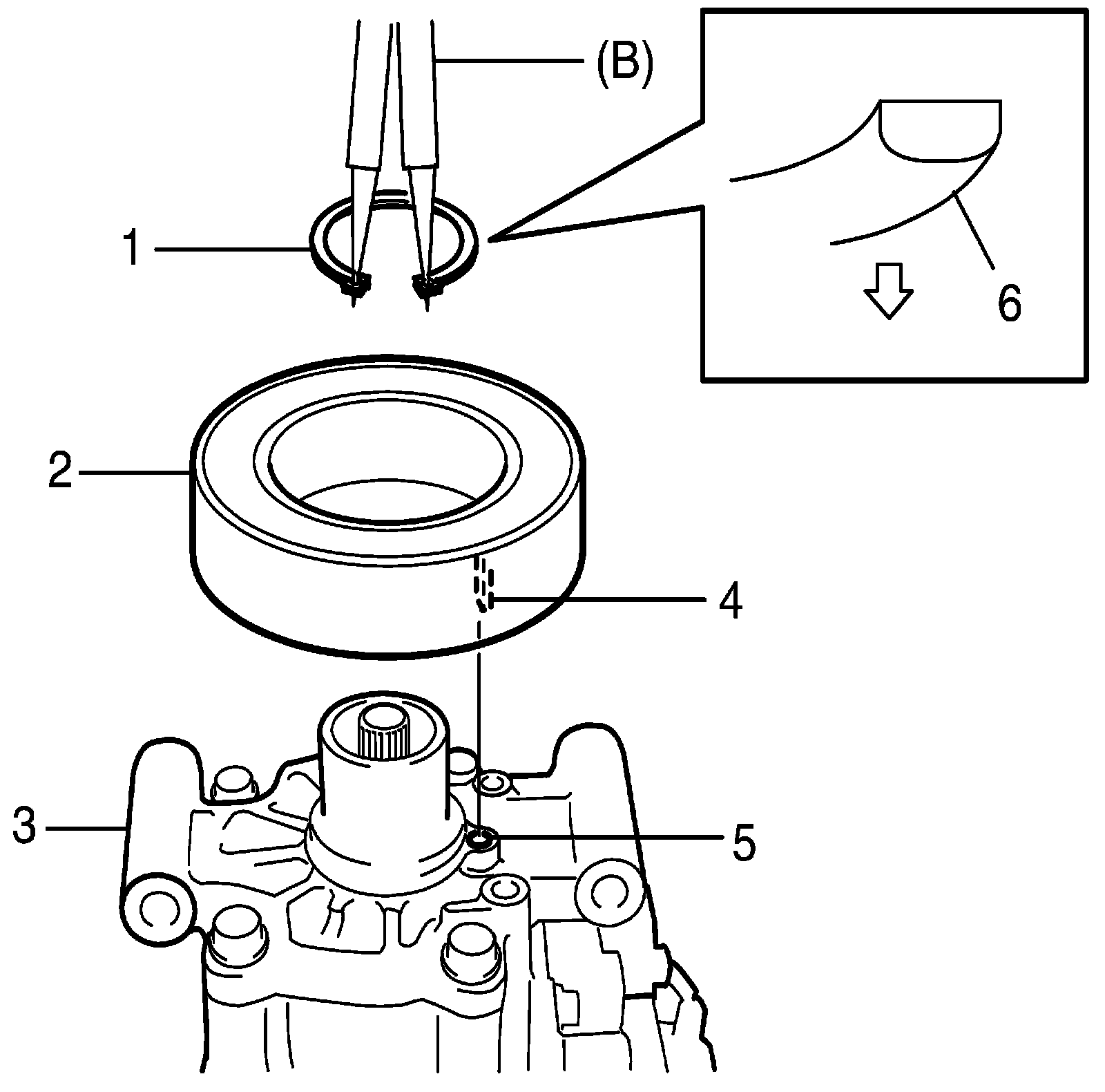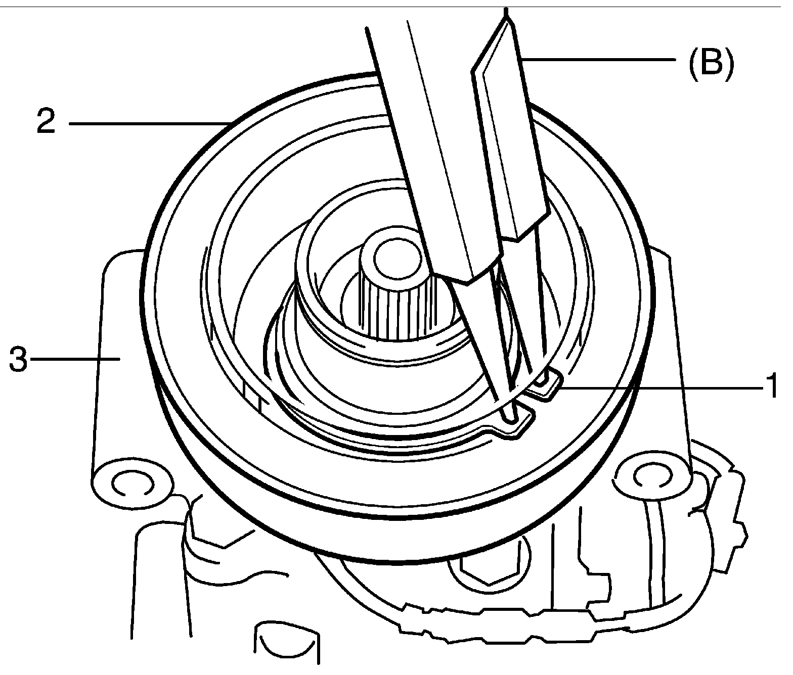 5. Install new circlip (2) directing chamfer side (3) upward.