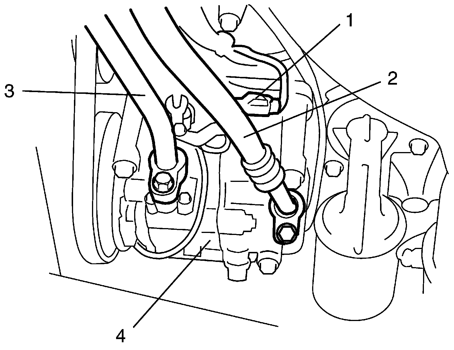 9. Disconnect discharge hose (2) and suction hose (3) from compressor (4).