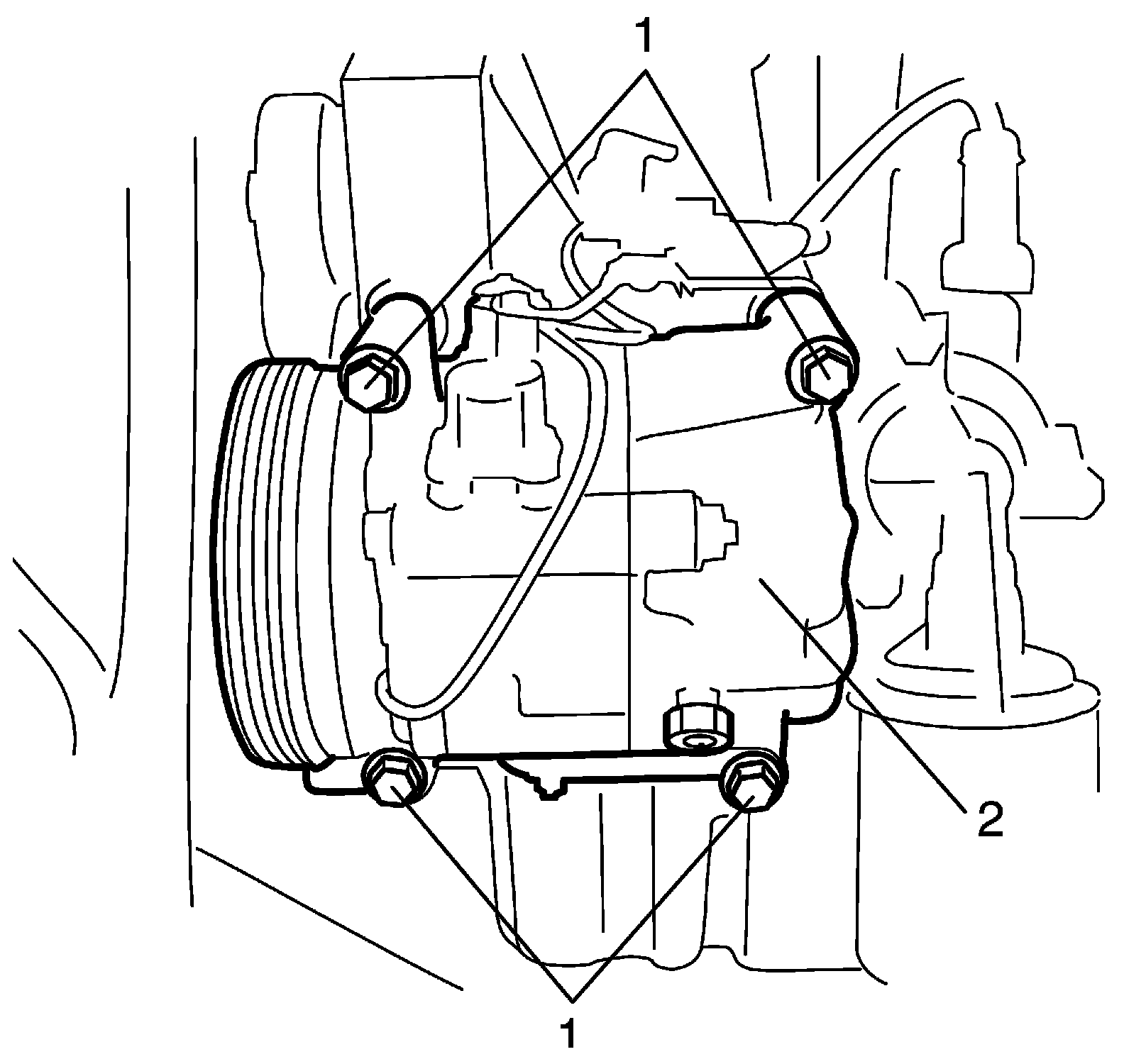 10. Remove compressor mounting bolts (1), and then remove compressor (2) from its bracket.