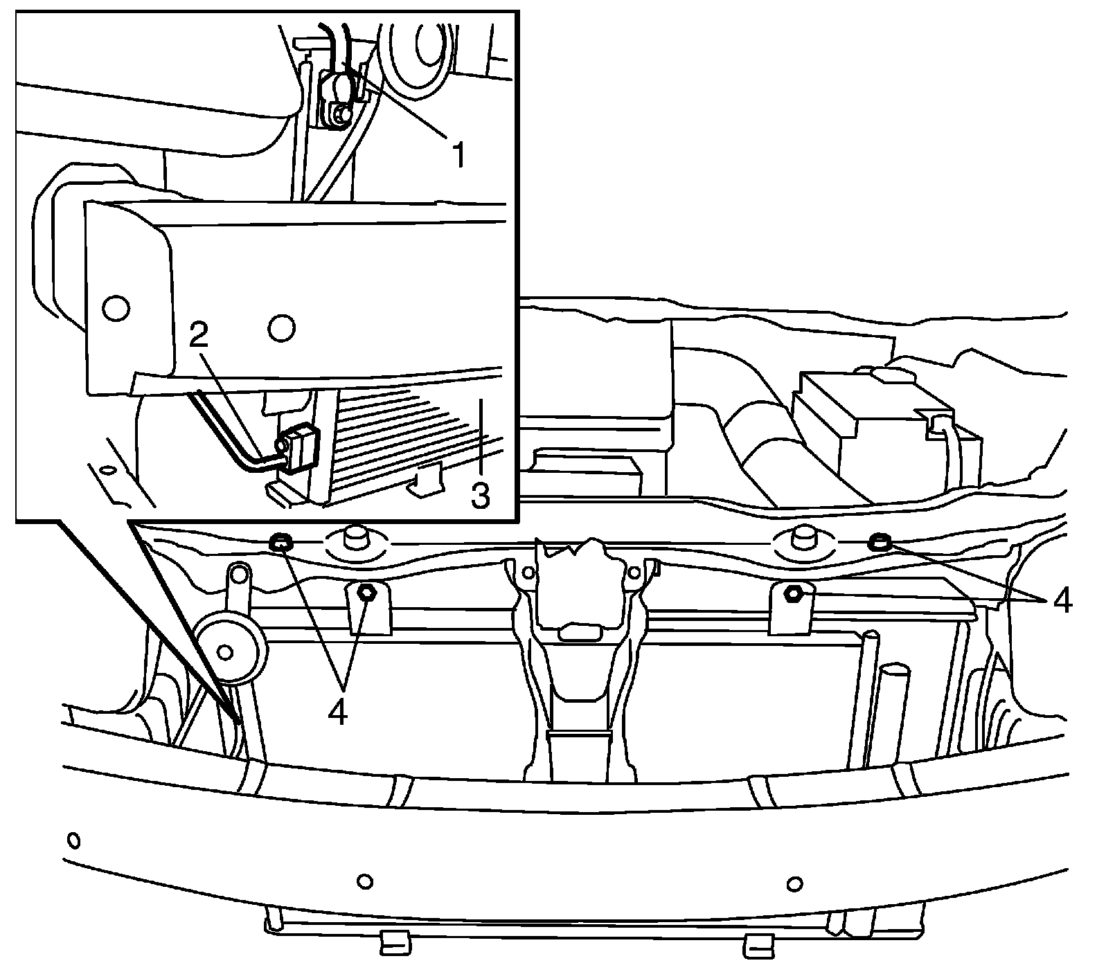 4. Remove radiator assembly and condenser assembly mounting bolts (4).