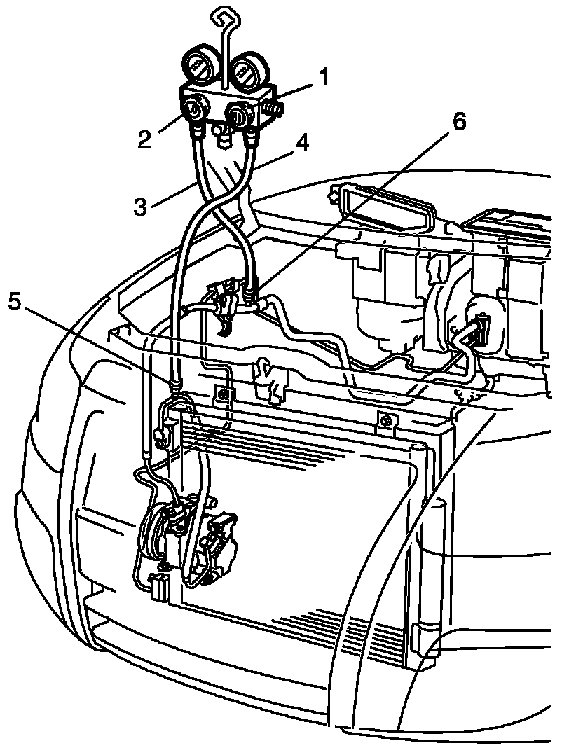 3. Connect high pressure charging hose (3) to high pressure service valve (5) on vehicle and low pressure charging hose (4) to low pressure service valve (6).