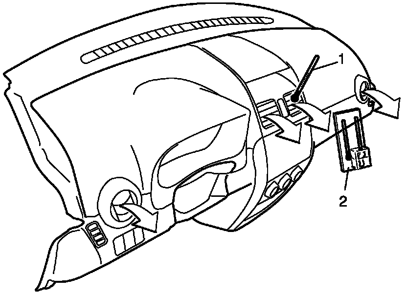 9. With about 20 mm (0.8 in.) of dry bulb thermometer (1) put right in front of center ventilation louver and a wet and dry bulb thermometer (2) near air inlet of HVAC unit.