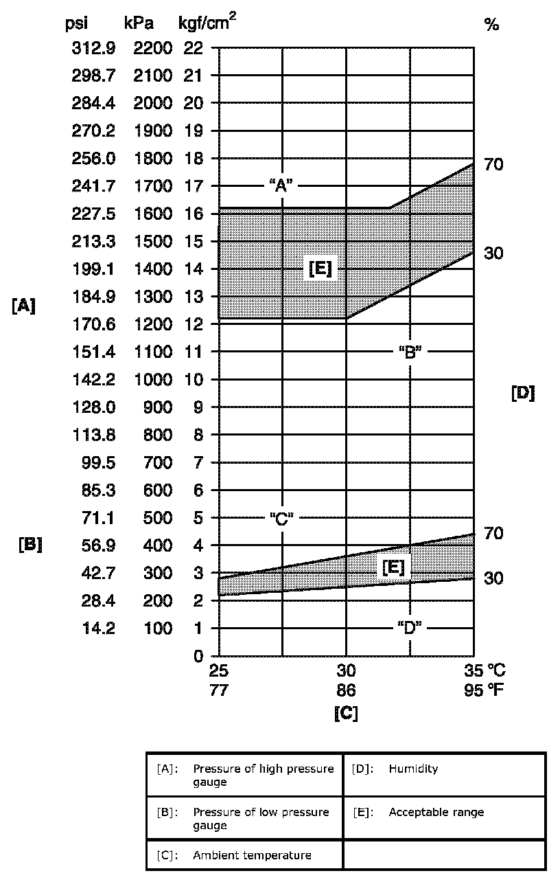 Pressure on high pressure gauge (HI): 1240 - 1620 kPa (12.4 - 16.2 kgf/sq.cm)