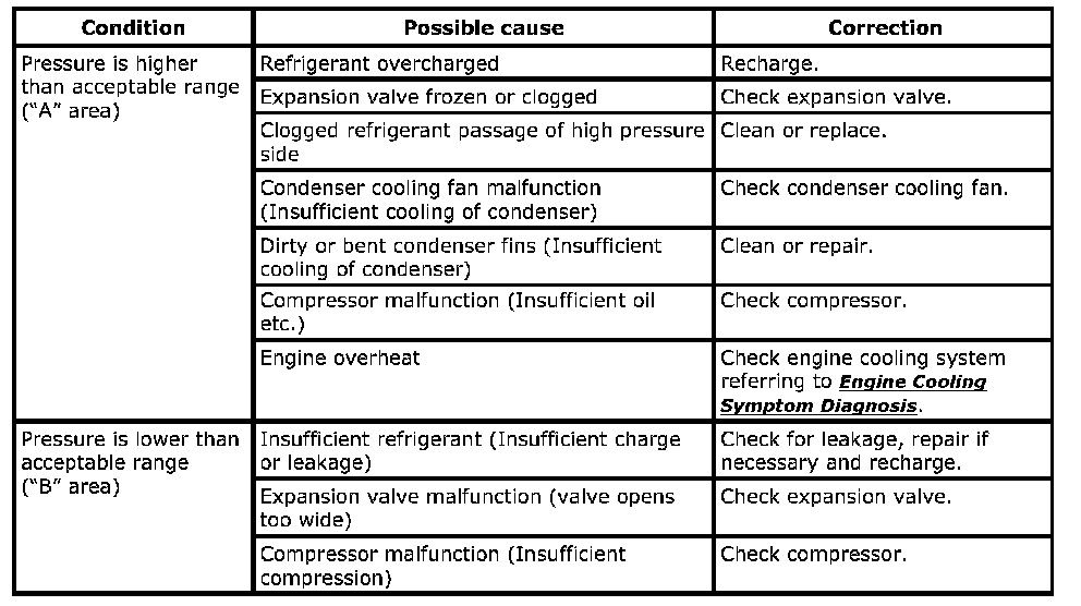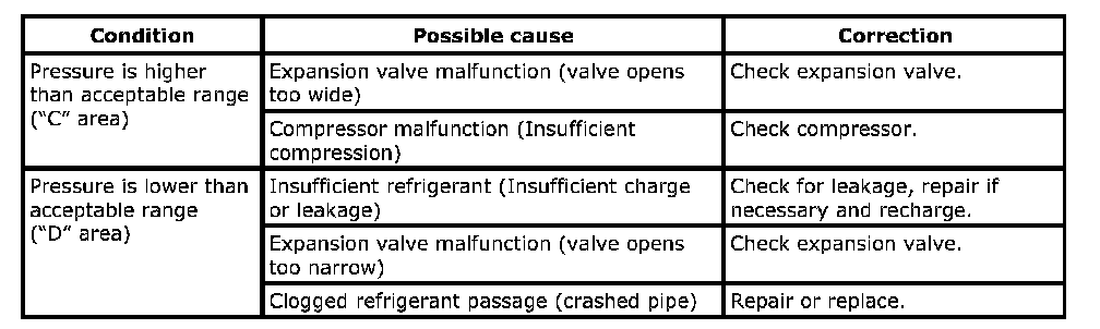 10. Check for each pressure of low side and high side if it is within shaded range of graph. If each gauge reading is out of specified pressure, correct defective part referring to the following table.
