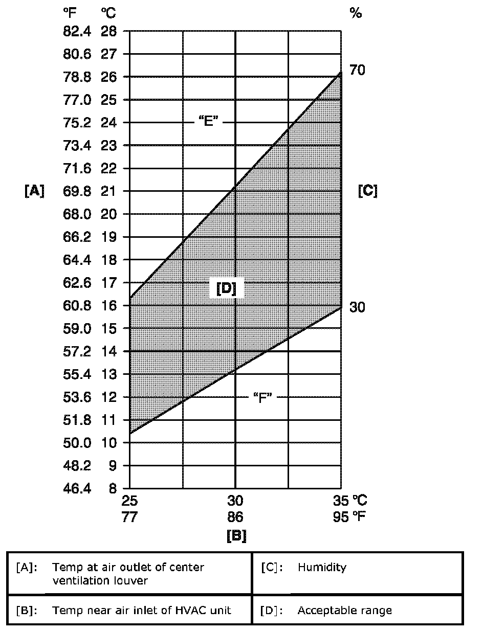 11. Check inlet port temperature-to-outlet port temperature relationship using the graph. For example, if temperature near air inlet of HVAC unit is 30 °C (86 °F) and the one at air outlet of center ventilation louver is 17 °C (62.6 °F), their crossing point is within acceptable range as shown in the graph. In this case, cooling performance is satisfactory and proper.