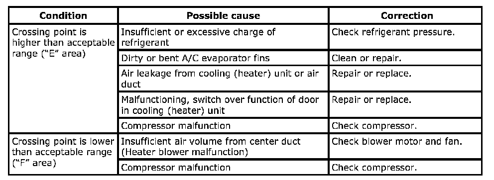 12. If crossing point is out of acceptable range, diagnose trouble referring to the following table.