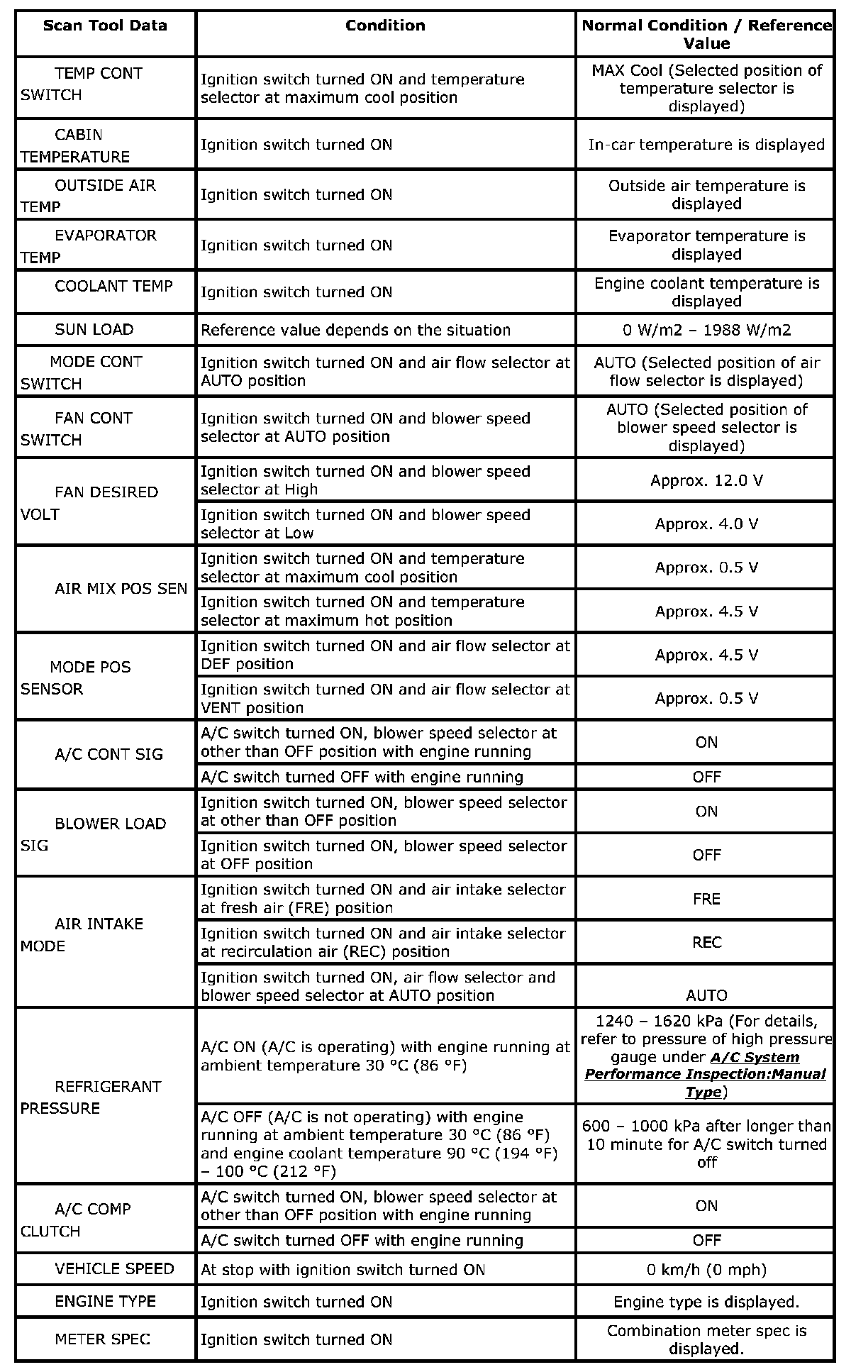 Scan Tool DataAs the data values given in the following are standard values estimated on the basis of values obtained from the normally operation vehicles by using a scan tool, use them as reference values. Even when the vehicles are in good condition, there may be cases where the checked values do not fall within each specifies data range. Therefore, judgement as abnormal should not be made by checking with these data alone.