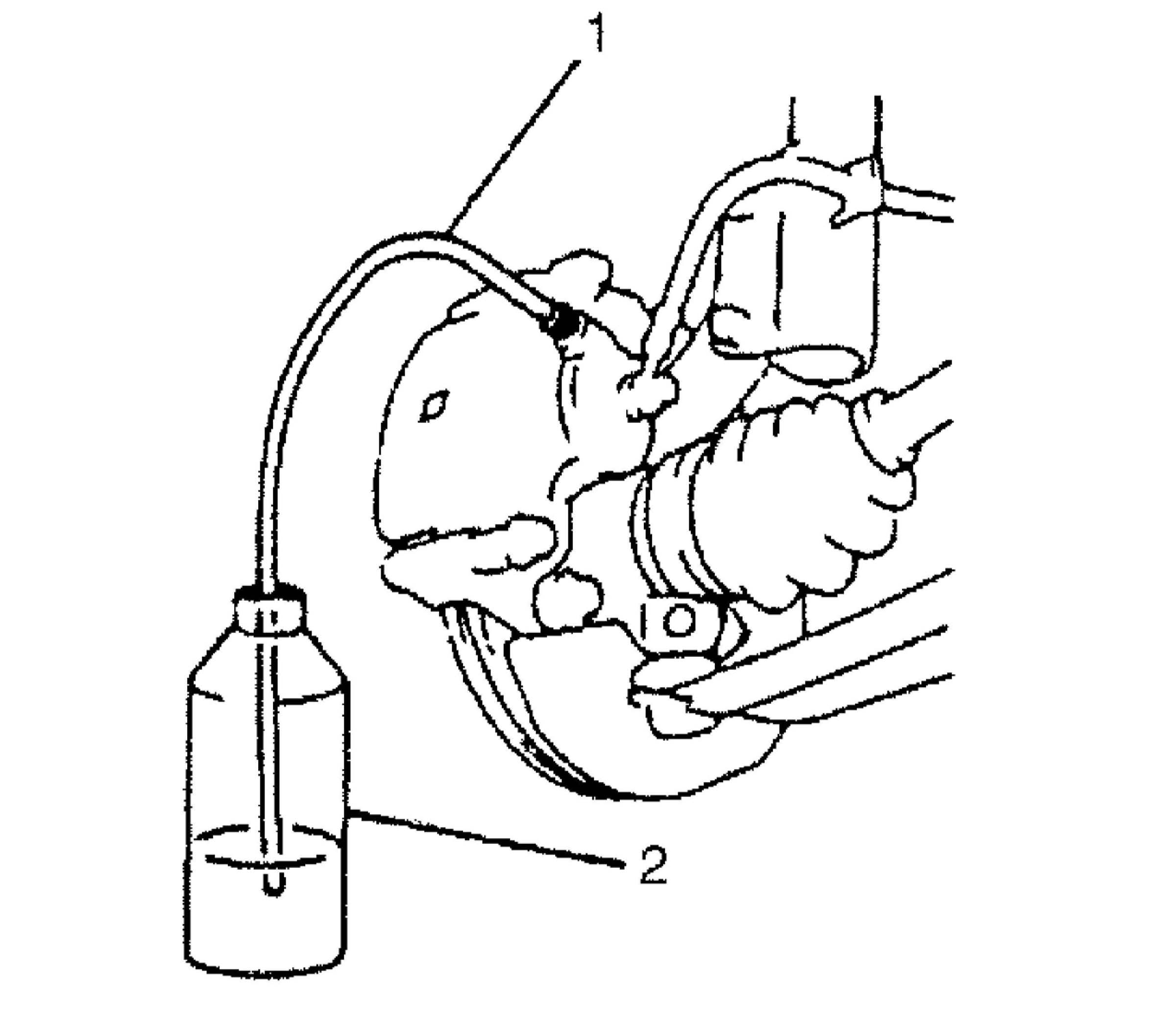 2. Remove bleeder plug cap. Attach a vinyl tube (1) to bleeder plug, and insert the other end into container (2).