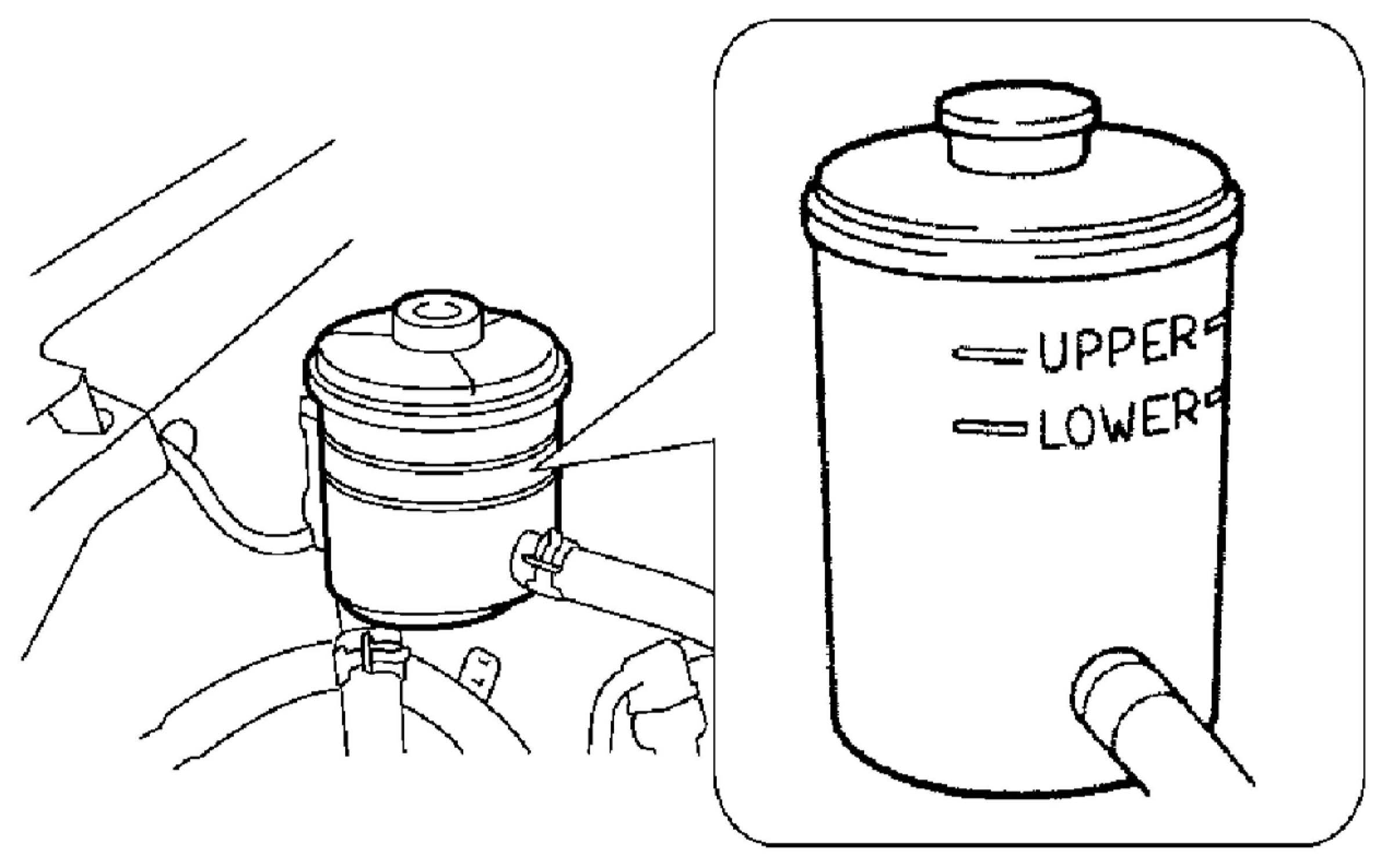 P/S Fluid Level CheckWith engine stopped, check fluid level indicated on P/S fluid reservoir, which should be between "UPPER" and "LOWER" marks. If it is lower than "LOWER" mark, fill fluid up to "UPPER" mark.