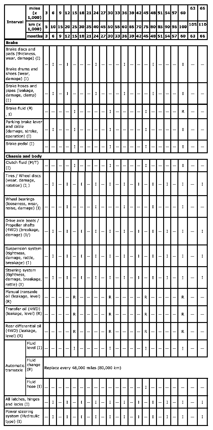 ^ This table includes service as scheduled up to 75,000 miles (125,000 km) mileage. Beyond 75,000 miles (125,000 km), carry out the same services at the same intervals respectively.
