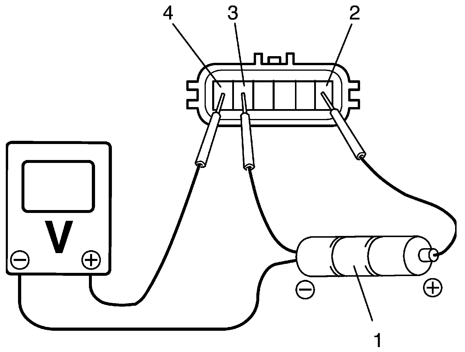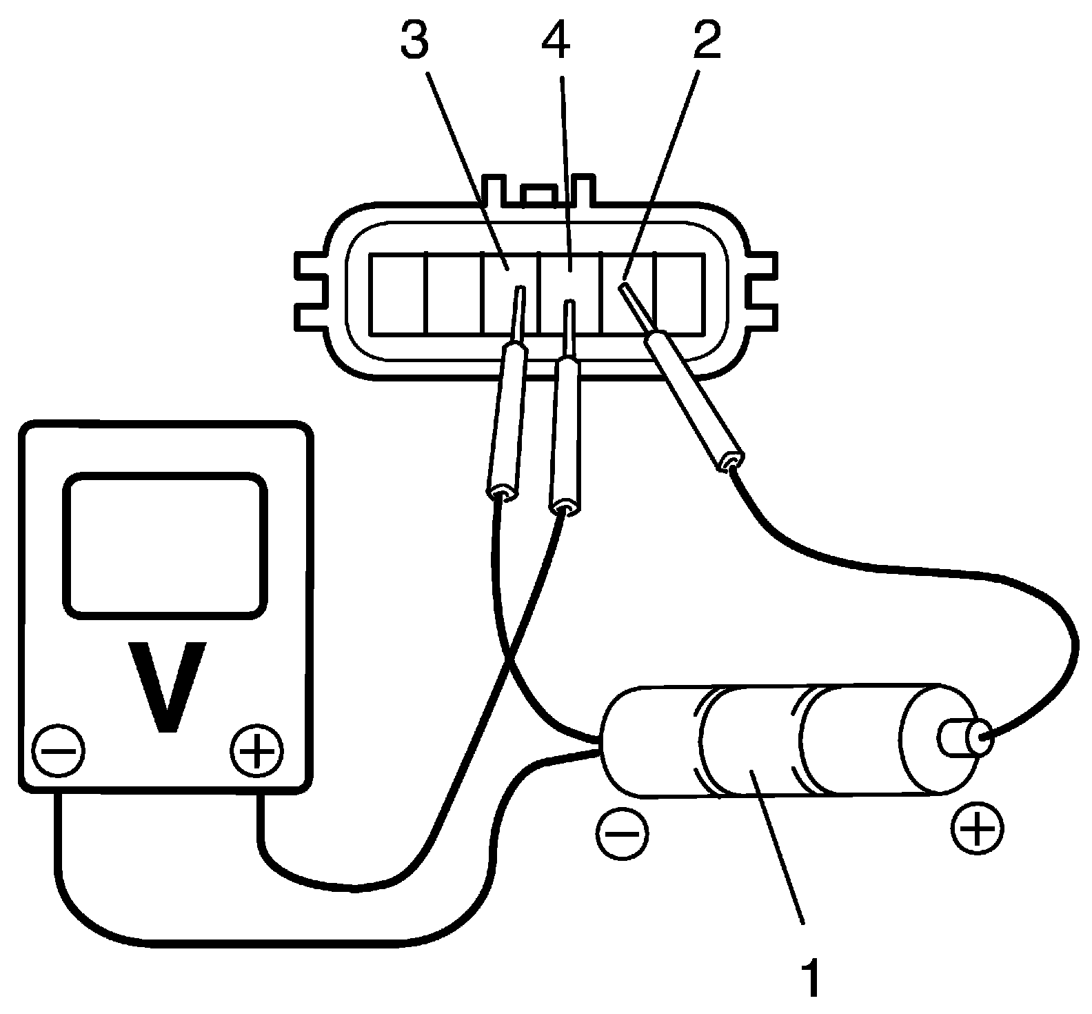 1. For APP sensor (main), arrange 3 new 1.5 V batteries (1) in series (check that total voltage is 4.5 - 5.0 V) and connect its positive terminal to "Vin 1" terminal (2) and negative terminal to "Ground 1" terminal (3) of sensor. Then using voltmeter, connect positive terminal to "Vout 1" terminal (4) of sensor and negative terminal to battery.