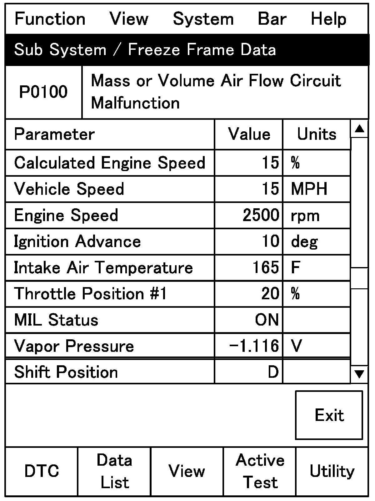 ECM stores the engine and driving conditions (in the form of data as shown) at the moment of the detection of a malfunction in its memory. This data is called "Freeze frame data". Therefore, it is possible to know engine and driving conditions (e.g., whether the engine was warm or not, where the vehicle was running or stopped, where air/fuel mixture was lean or rich) when a malfunction was detected by checking the freeze frame data. Also, ECM has a function to store each freeze frame data for three different malfunctions in the order as the malfunction is detected. Utilizing this function, it is possible to know the order of malfunctions that have been detected. Its use is helpful when rechecking or diagnosing a trouble.