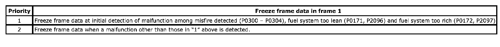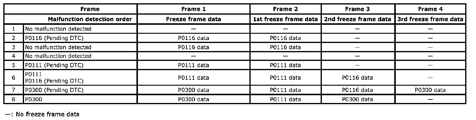 In the 2nd through the 4th frames, the freeze frame data of each malfunction is stored in the order as the malfunction is detected. These data are not updated. Shown in the table below are examples of how freeze frame data are stored when two or more malfunctions are detected.