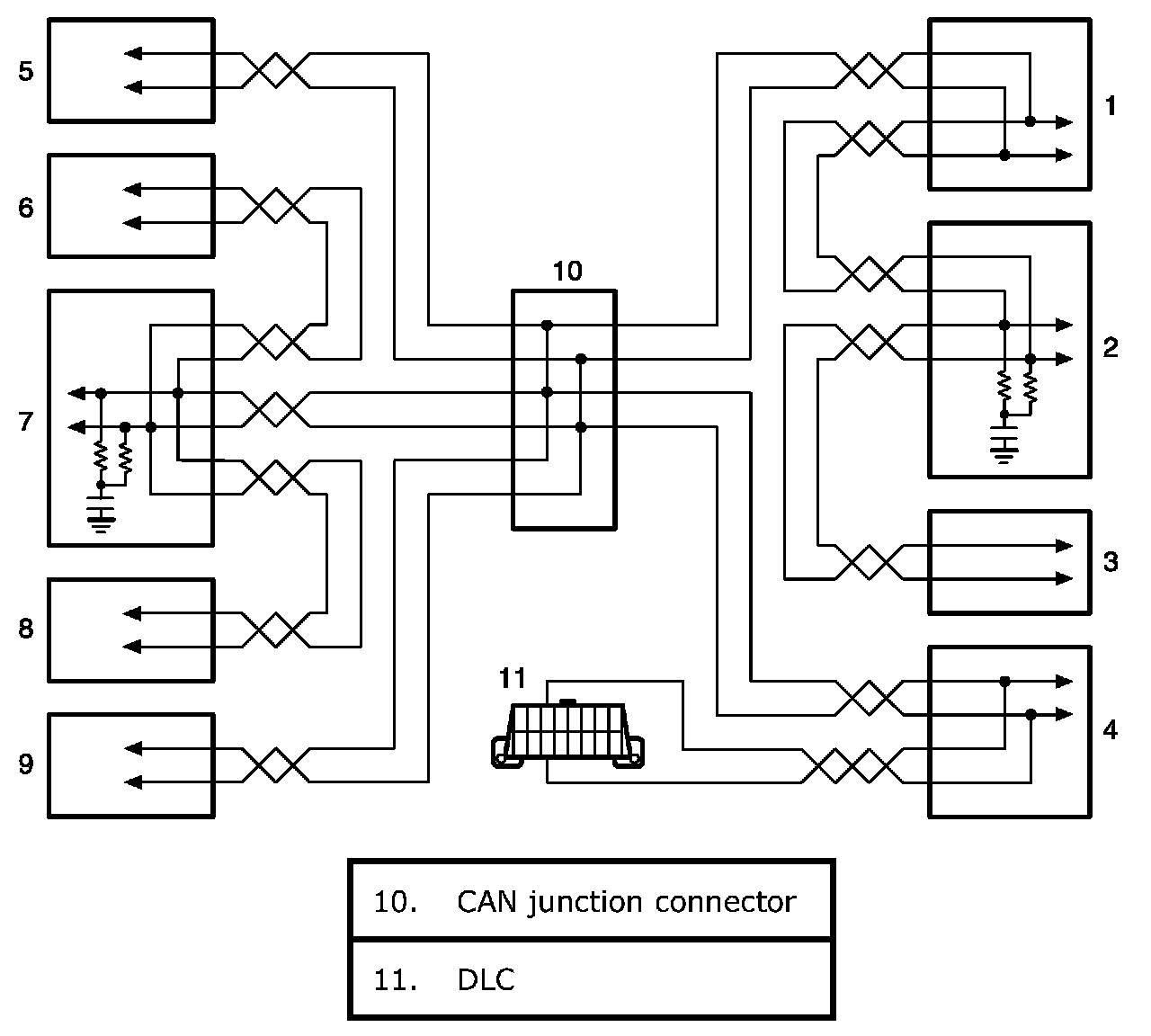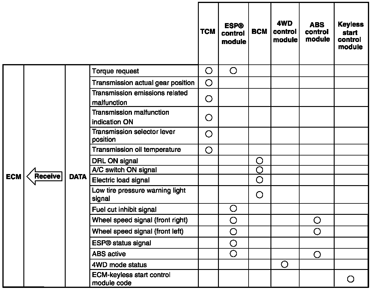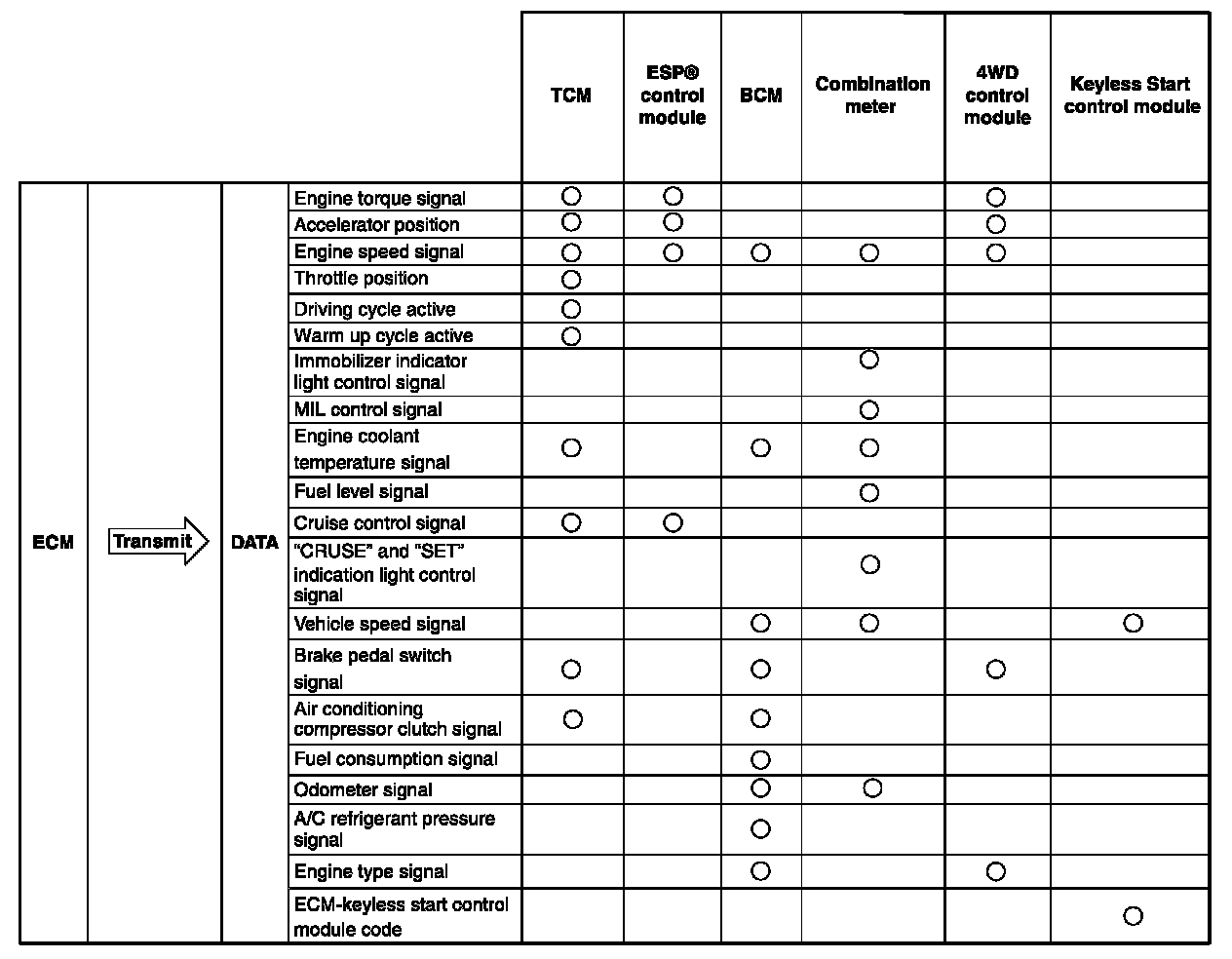 CAN Communication System DescriptionECM (2), ABS / ESP(R) control module (1), TCM (3), BCM (4), 4WD control module (6), combination meter (7), keyless start control module (5), steering angle sensor (ESP(R) model) (8), yaw rate/G sensor (ESP(R) model) (9) and ID controller (Canada model) (10) communicate control data between each control module.