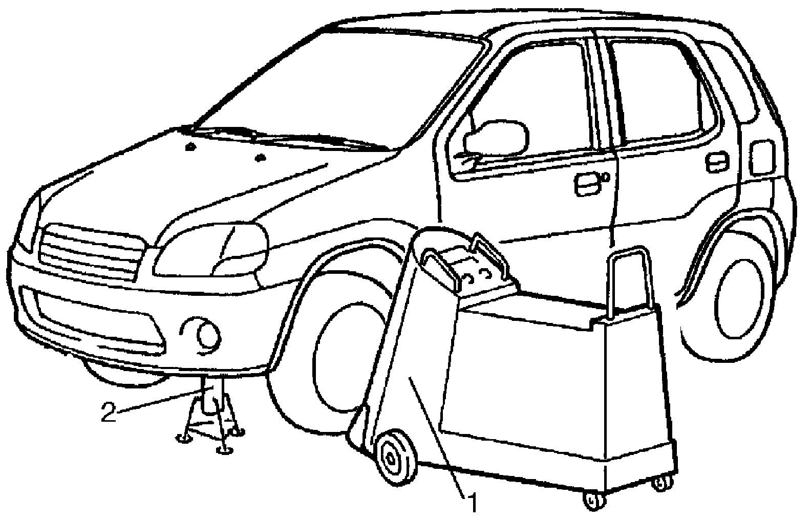 ^ When using On-vehicle type wheel balancing equipment (1), be sure to select 4WD system to 4WD-auto or 4WD-lock modes and jack up all four wheels, off the ground completely and support vehicle with safety stands (2). Be careful of the other wheels, which will rotate at the same time. Using it with 2WD mode may damage coupling.