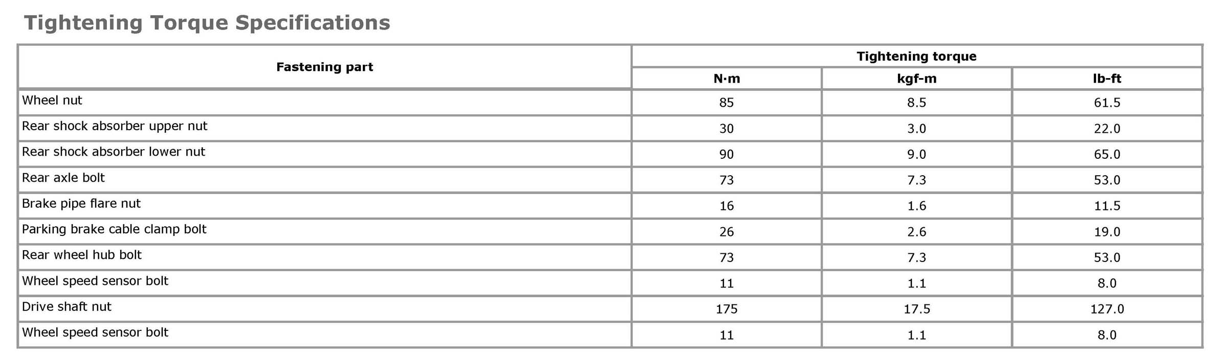 Tightening Torque SpecificationsNOTE: The specified tightening torque is also described in the following. Rear Suspension Components