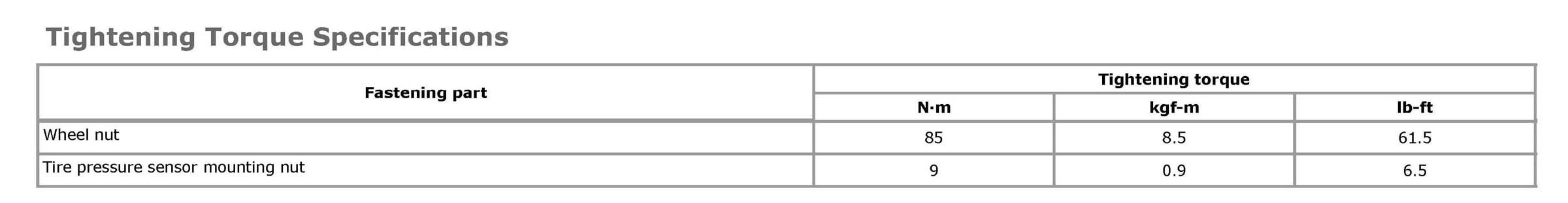 Tightening Torque Specifications