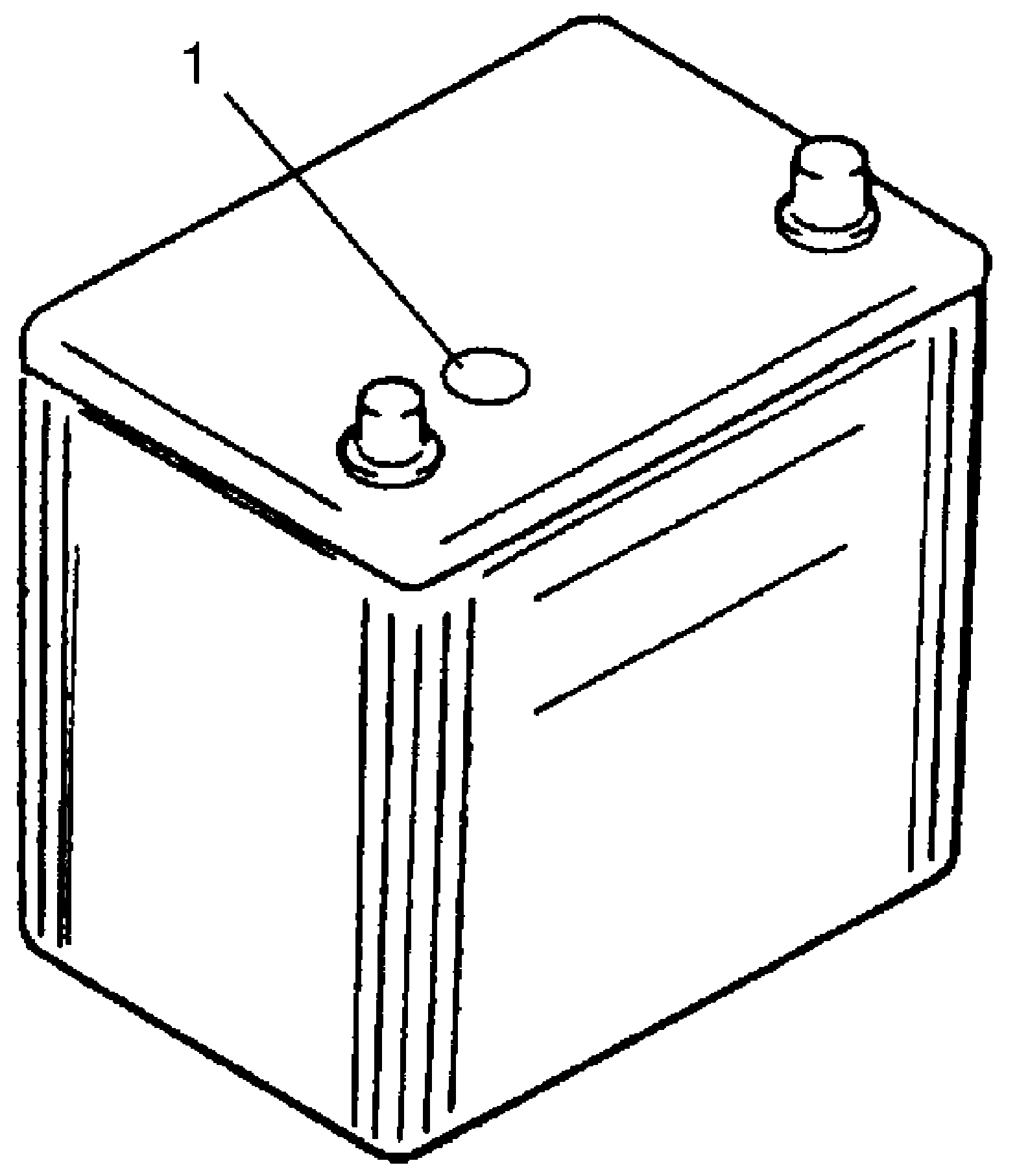 The battery has a built-in temperature compensated indicator (1) in the top of the battery. This indicator is to be used with the following diagnostic procedure.