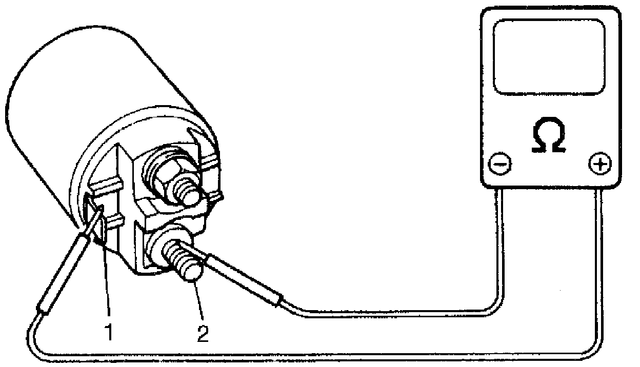 Check for continuity across magnetic switch "S" terminal (1) and "M" terminal (2). If no continuity, coil is open and should be replaced.