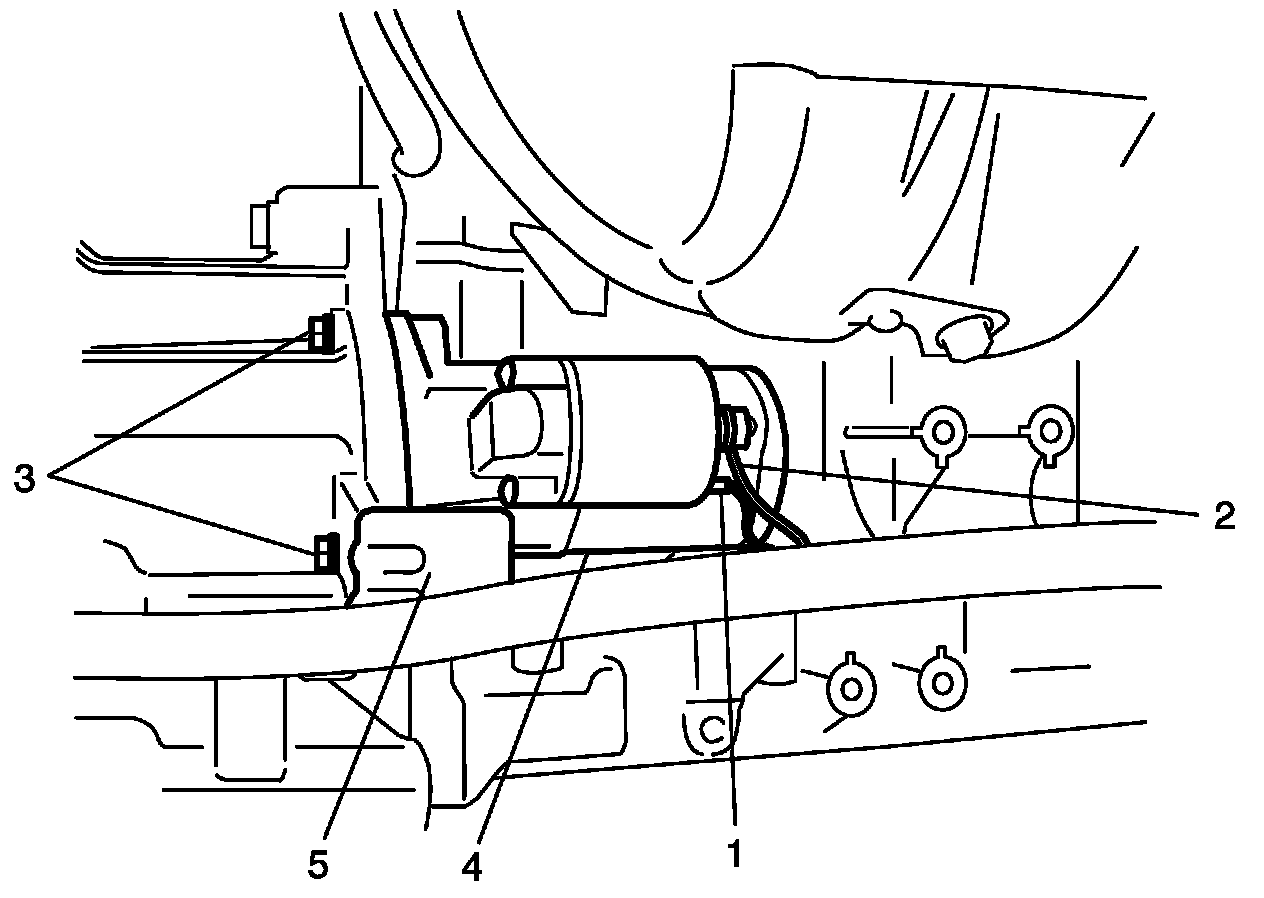 3. Remove starting motor mount bolt (3) and then starting motor (4) and bracket (5).