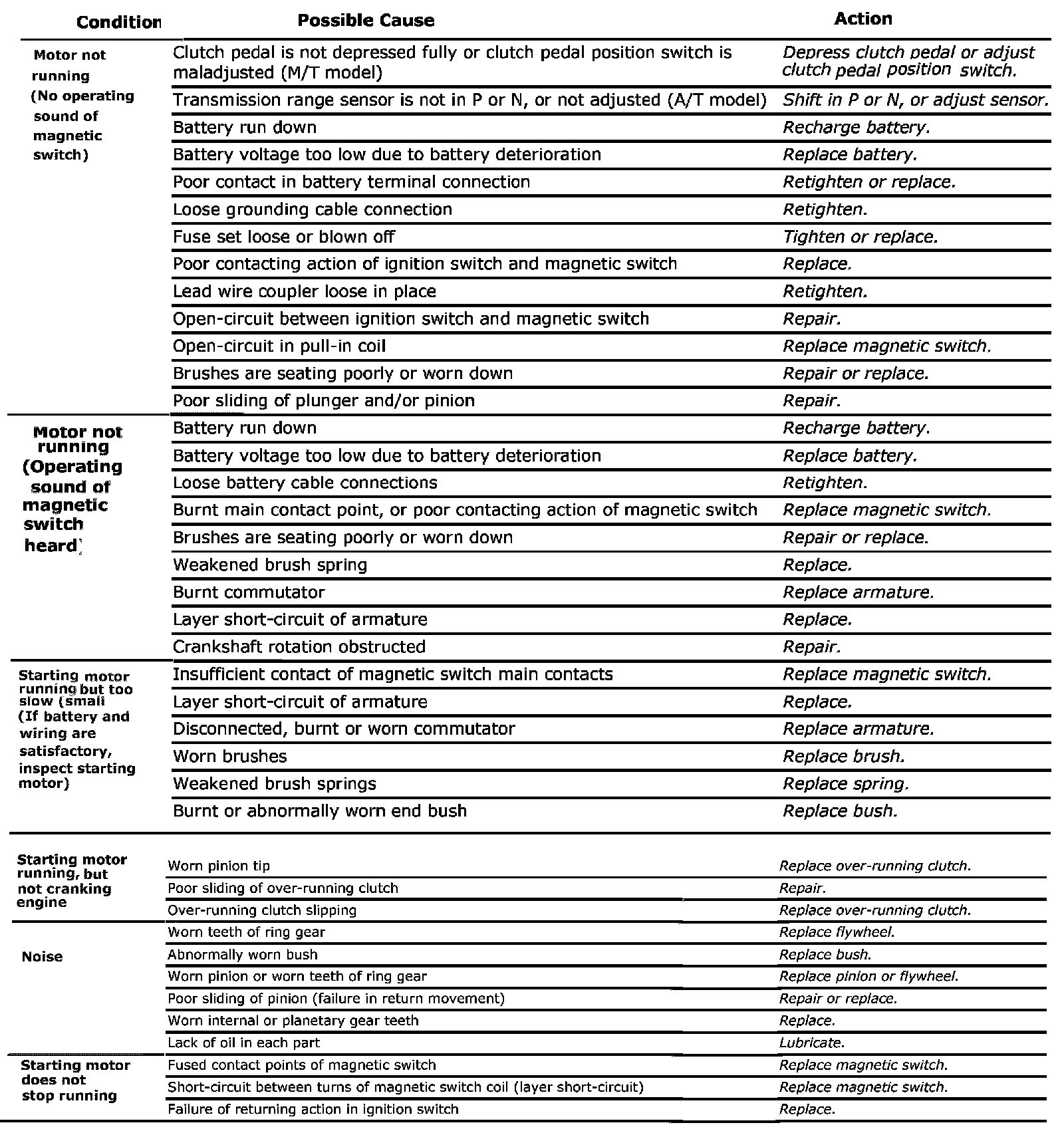 Cranking System Symptom DiagnosisPossible symptoms due to starting system trouble would be as follows: