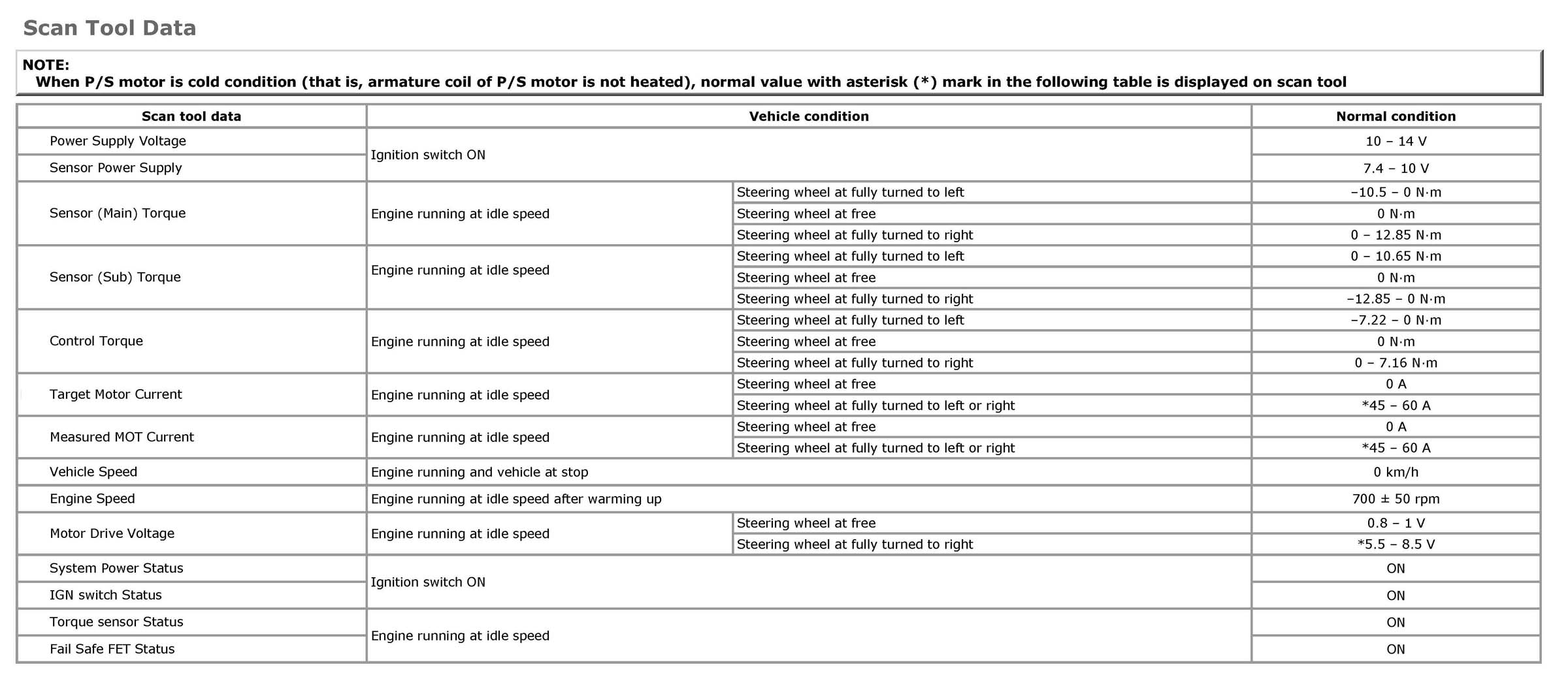 Scan Tool DataNOTE: When P/S motor is cold condition (that is, armature coil of P/S motor is not heated), normal value with asterisk (*) mark in the following table is displayed on scan tool