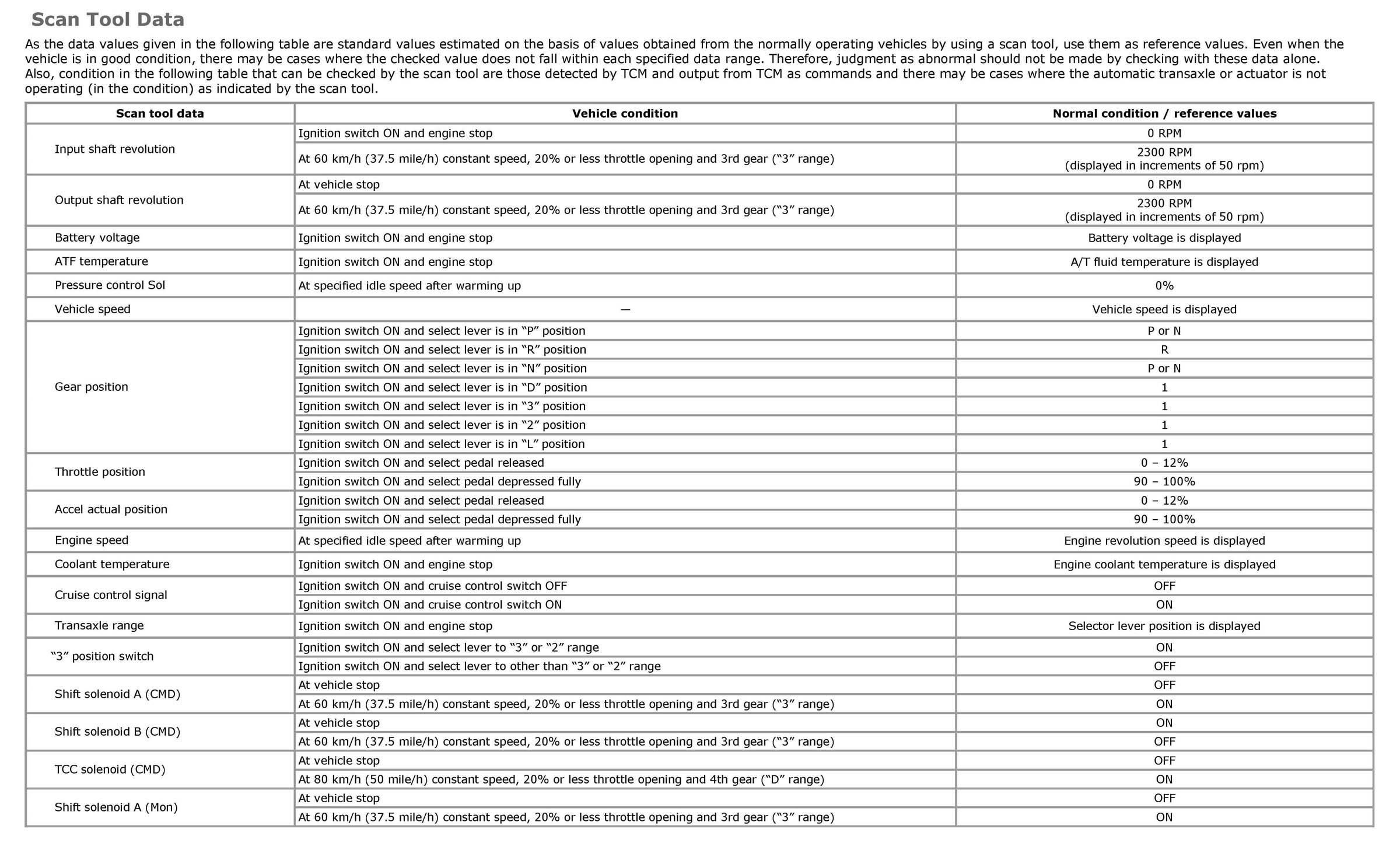 Also, condition in the following table that can be checked by the scan tool are those detected by TCM and output from TCM as commands and there may be cases where the automatic transaxle or actuator is not operating (in the condition) as indicated by the scan tool.