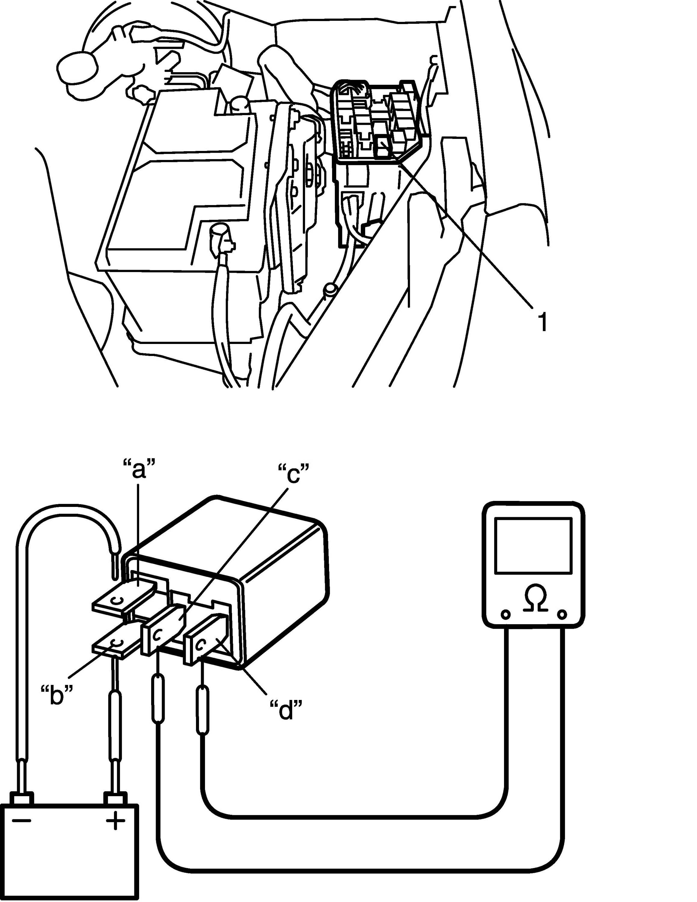 4. Connect battery positive (+) terminal to terminal "b" of relay. Connect battery negative (-) terminal to terminal "a" of relay. Check for continuity between terminal "c" and "d". If there is no continuity when relay is connected to the battery, replace relay.