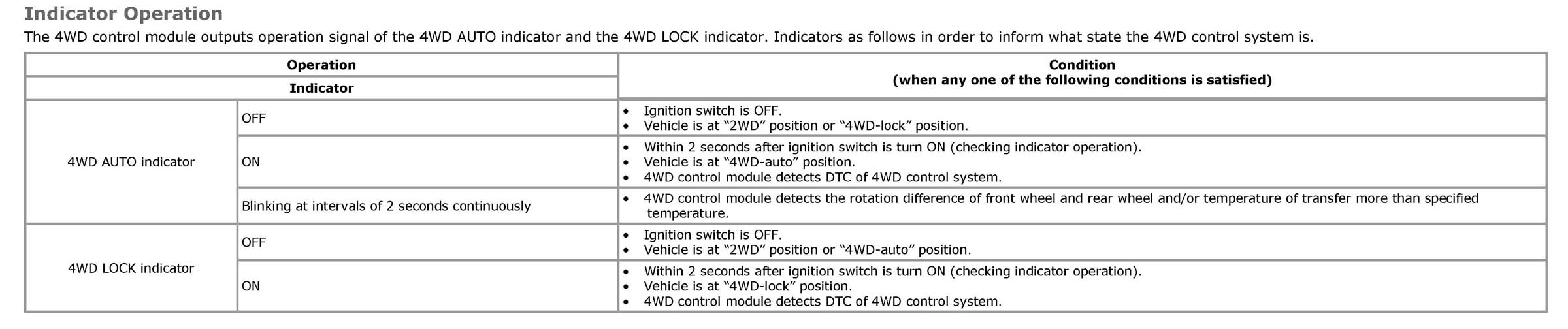 The 4WD control module outputs operation signal of the 4WD AUTO indicator and the 4WD LOCK indicator. Indicators as follows in order to inform what state the 4WD control system is.