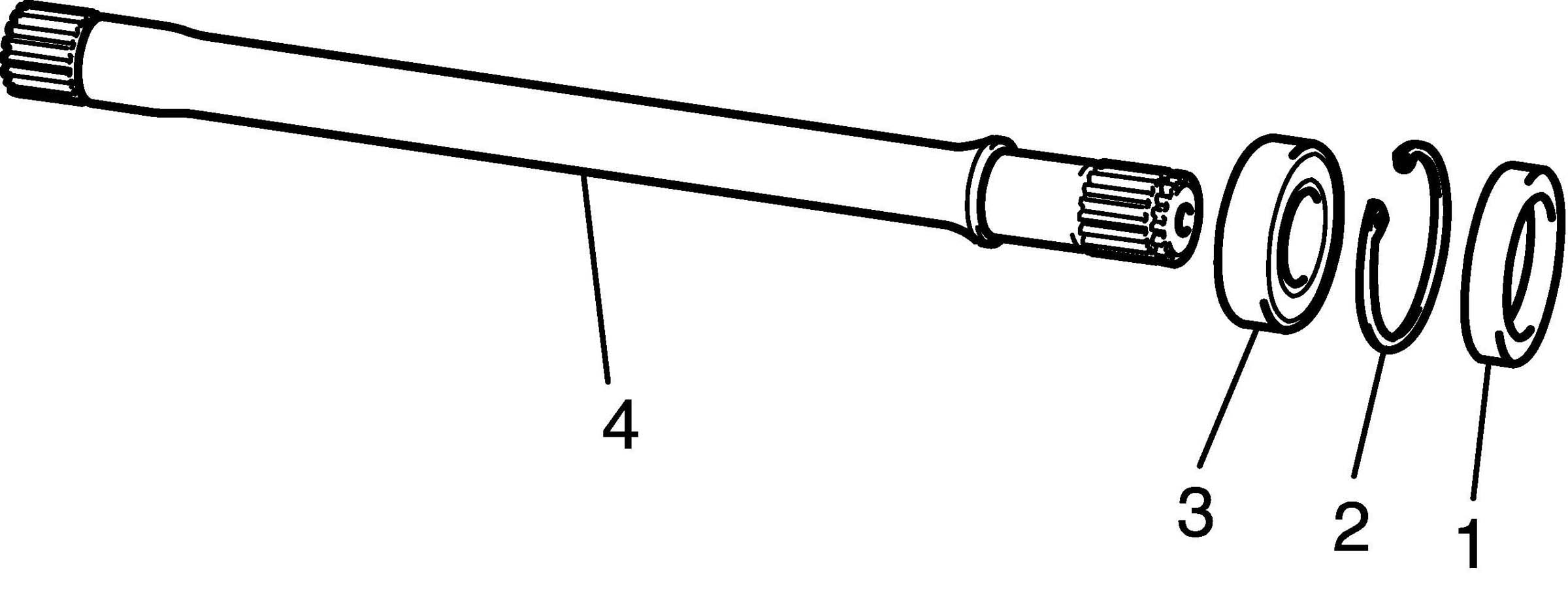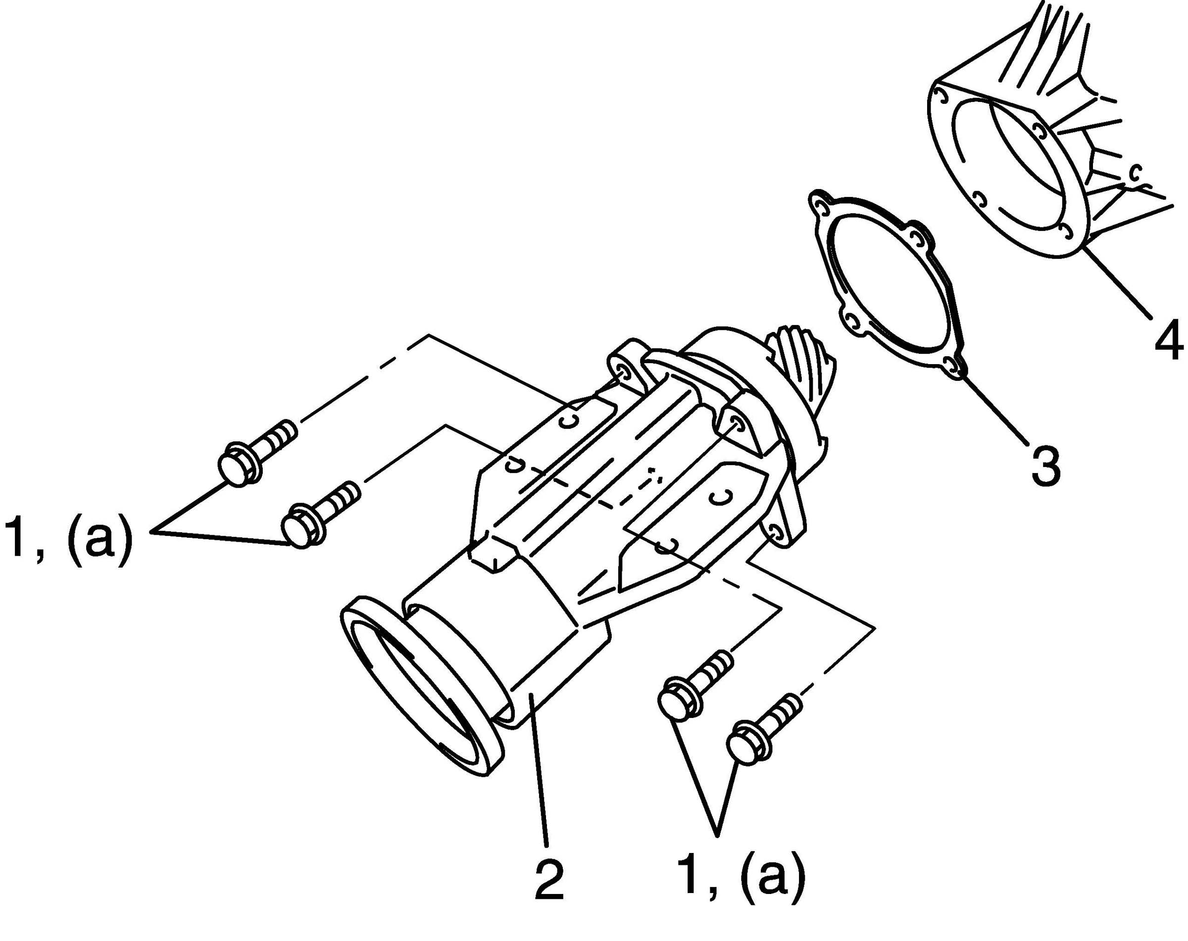7. Install transfer output retainer assembly (2) with bevel pinion shim (3) to transfer left case (4) by tightening retainer bolt (1) to specified torque.