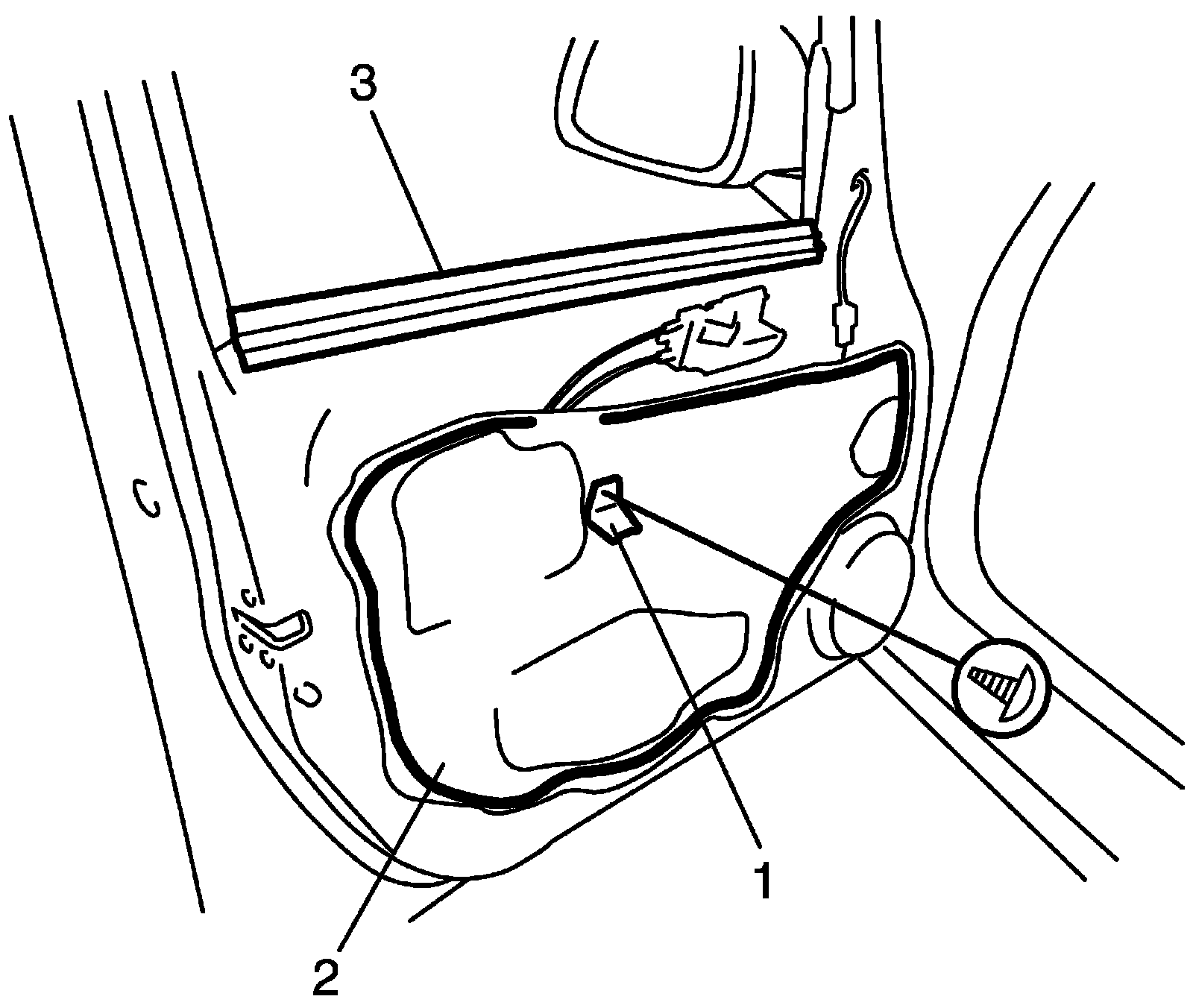7. Remove door glass mounting screws (1).