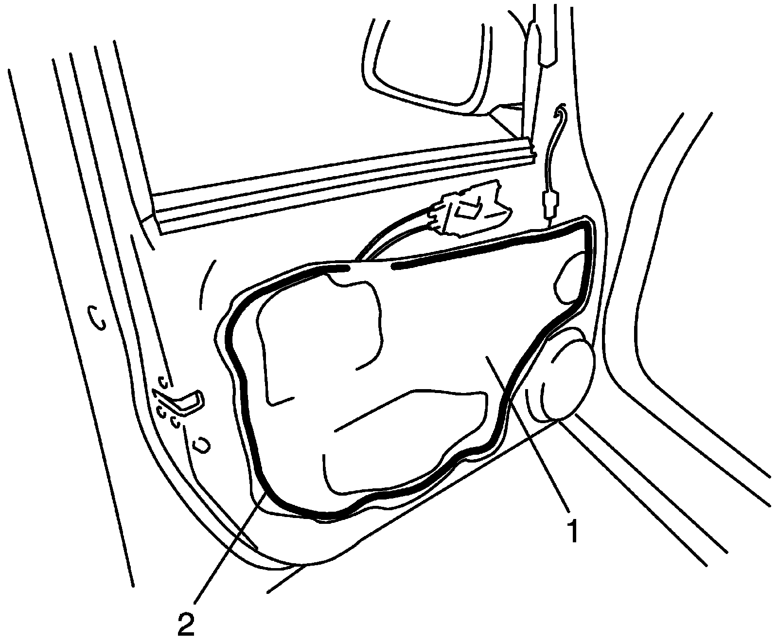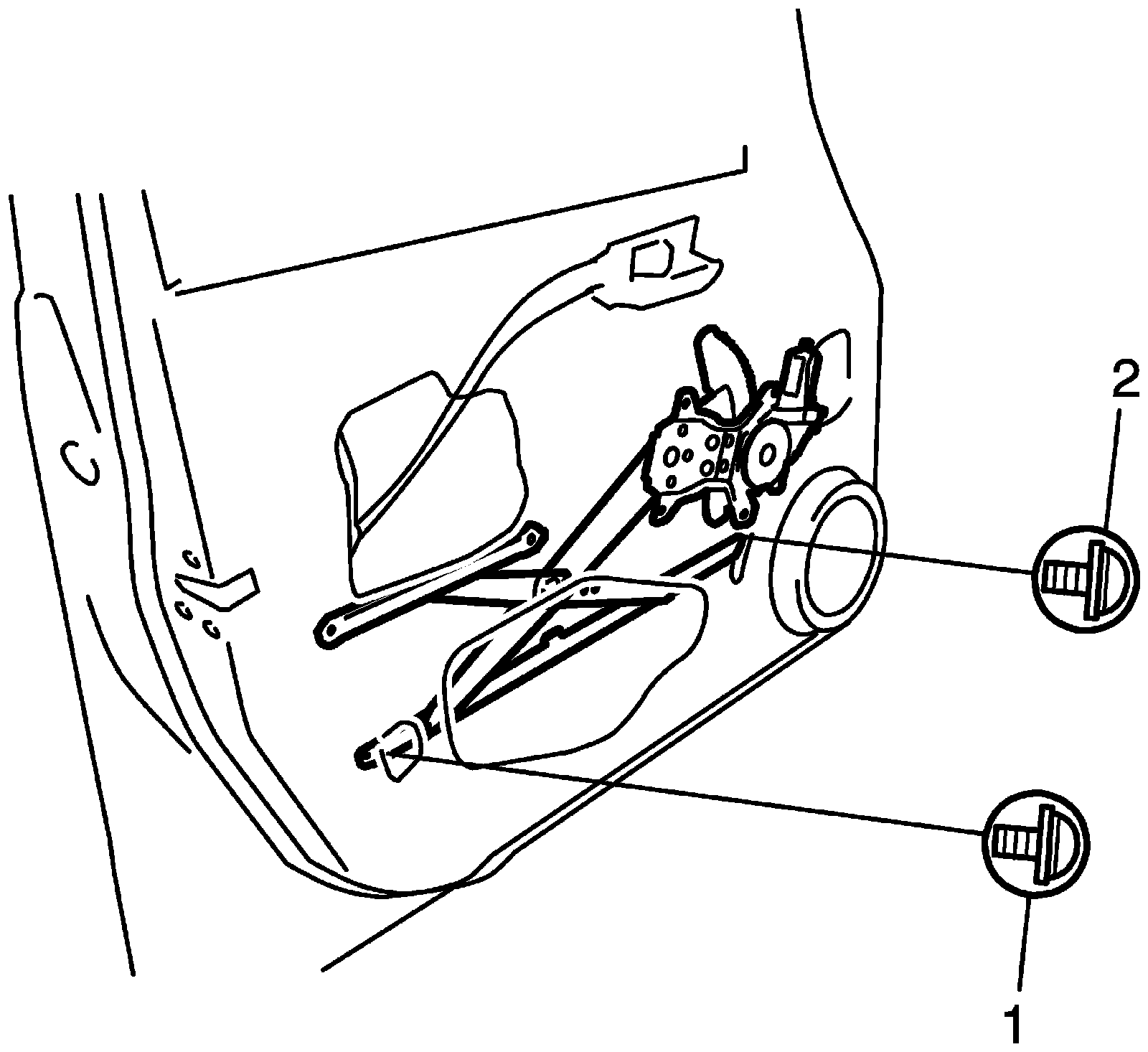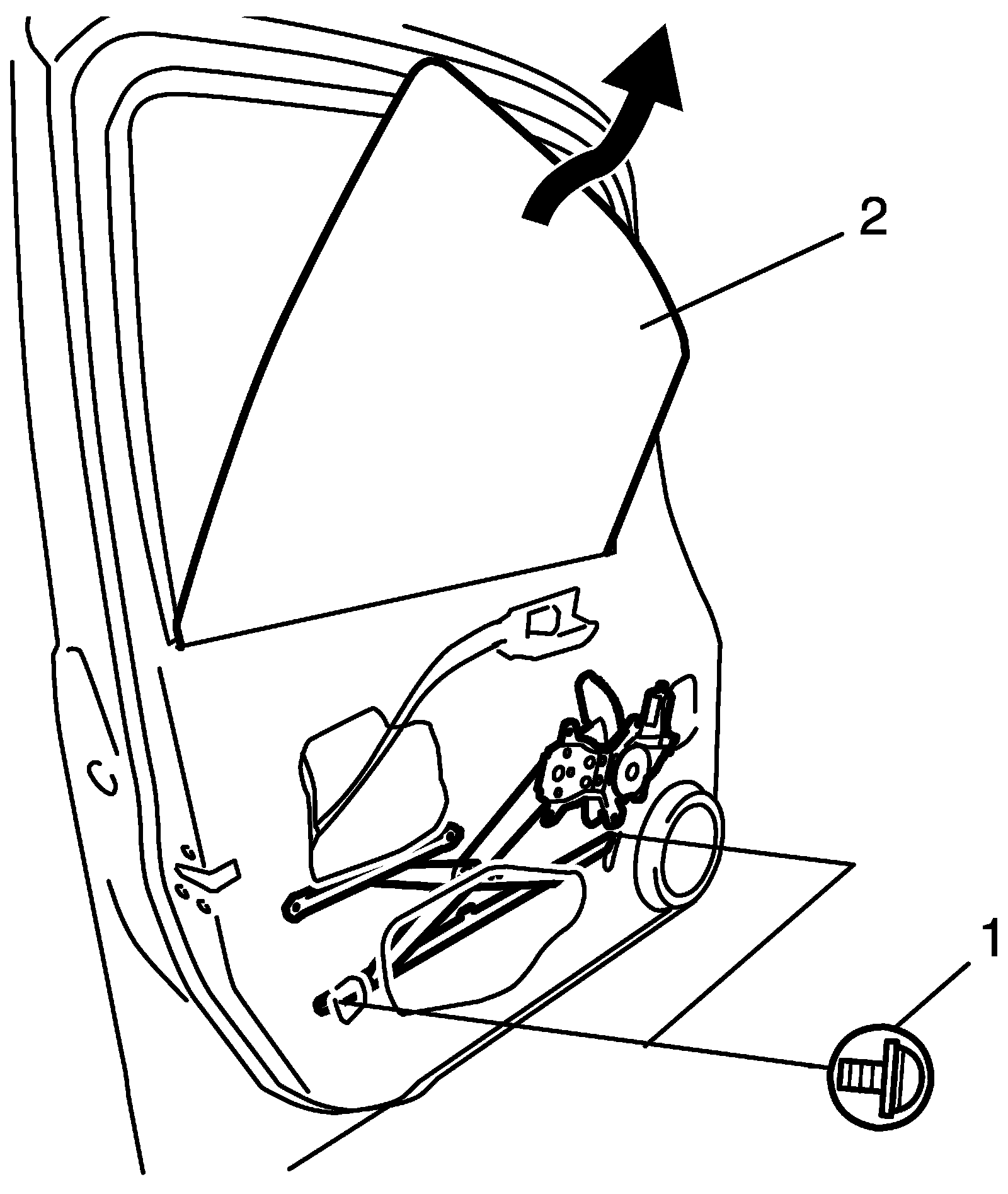 ^ Tighten door glass rear mounting screw (1) first, and then tighten door glass front mounting. screw (2).