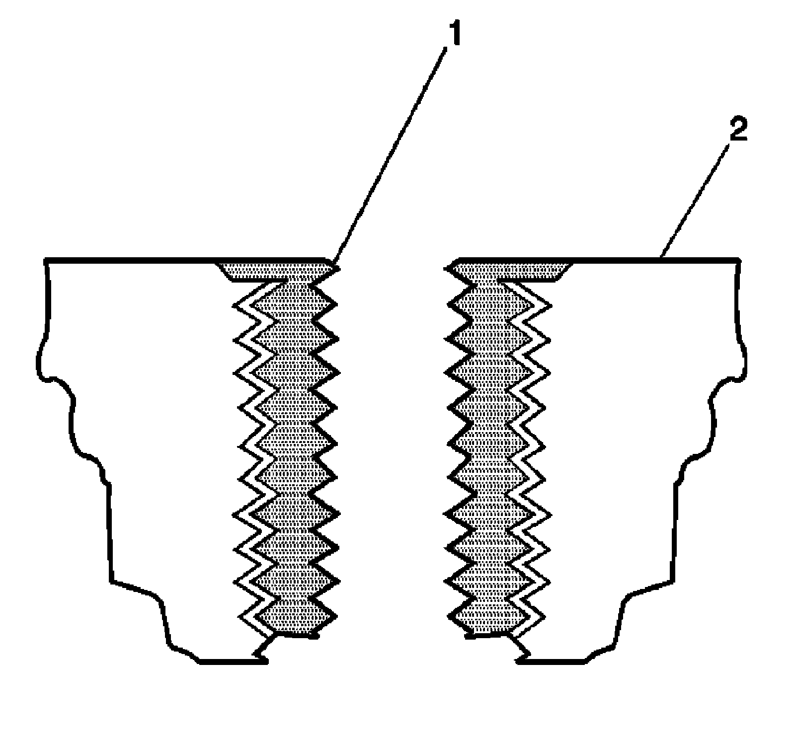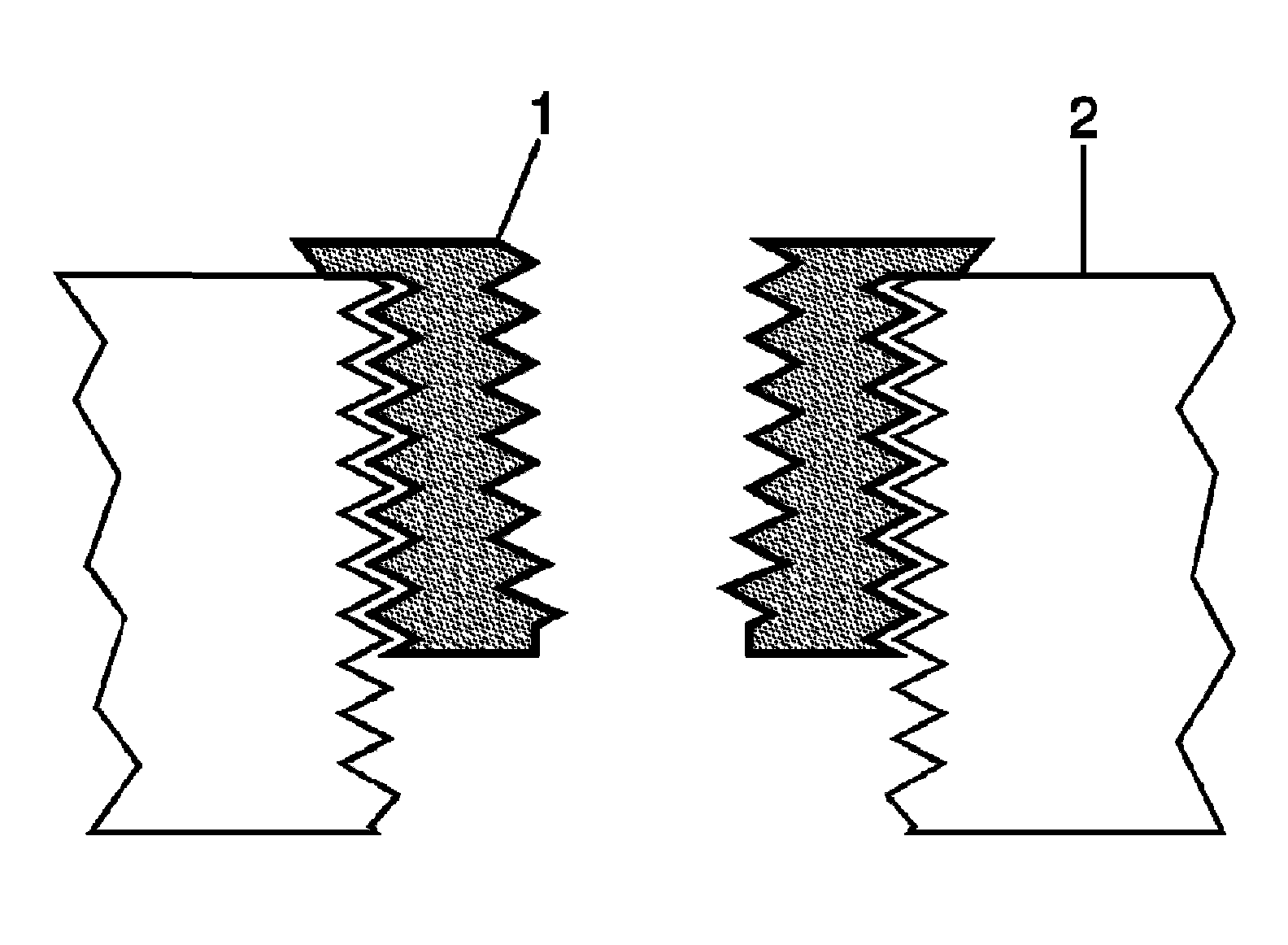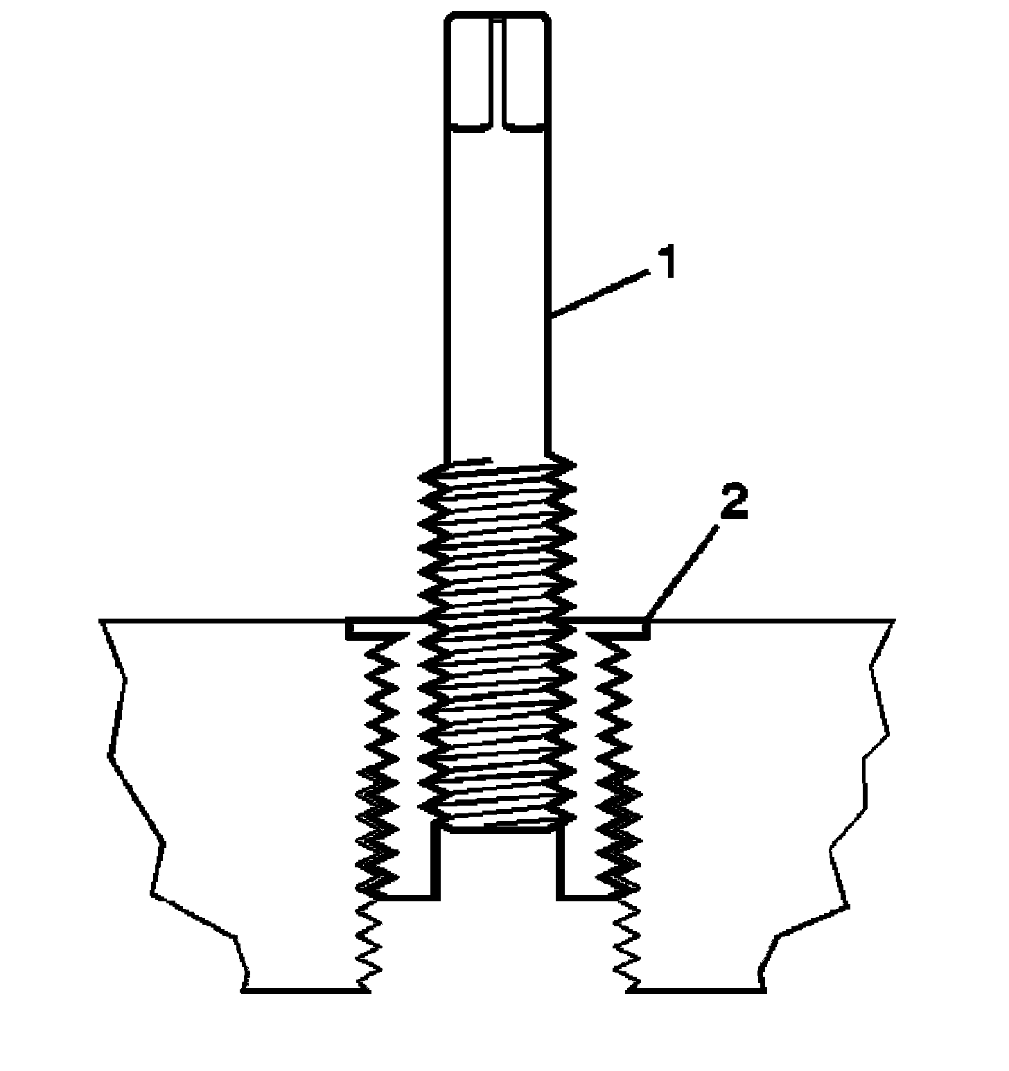 10. Apply threadlock sealant GM P/N 12345493, (Canadian P/N 10953488), J 42385-109, LOCTITE 277(R) or equivalent (1) to the insert OD threads (2).
