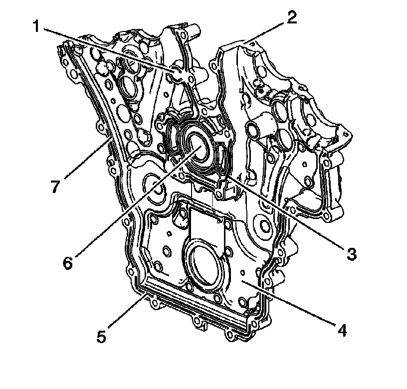 ^ Gouges or damage to the engine front cover sealing surfaces to the engine block (7), oil pan (5), and/or camshaft covers (2)