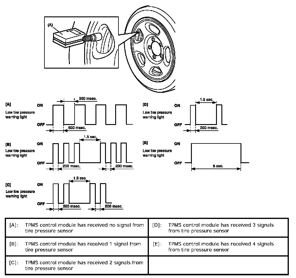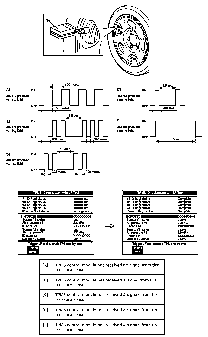 - If each ID code of 4 tire pressure sensors is not registered in BCM within 90 seconds, start all over from Step 1). Also, it is possible to check the number of ID codes of tire pressure sensors received by BCM by observing the flashing pattern of the low tire pressure warning light.