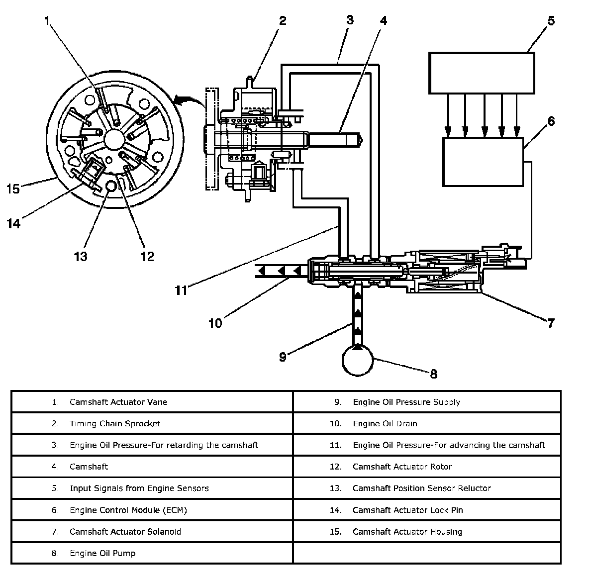 The camshaft actuator system enables the engine control module (ECM) to change camshaft timing of all 4 camshafts while the engine is operating. The CMP actuator assembly (15) varies the camshaft position in response to directional changes in oil pressure. The CMP actuator solenoid valve controls the oil pressure that is applied to advance or retard a camshaft. Modifying camshaft timing under changing engine demand provides better balance between the following performance concerns: