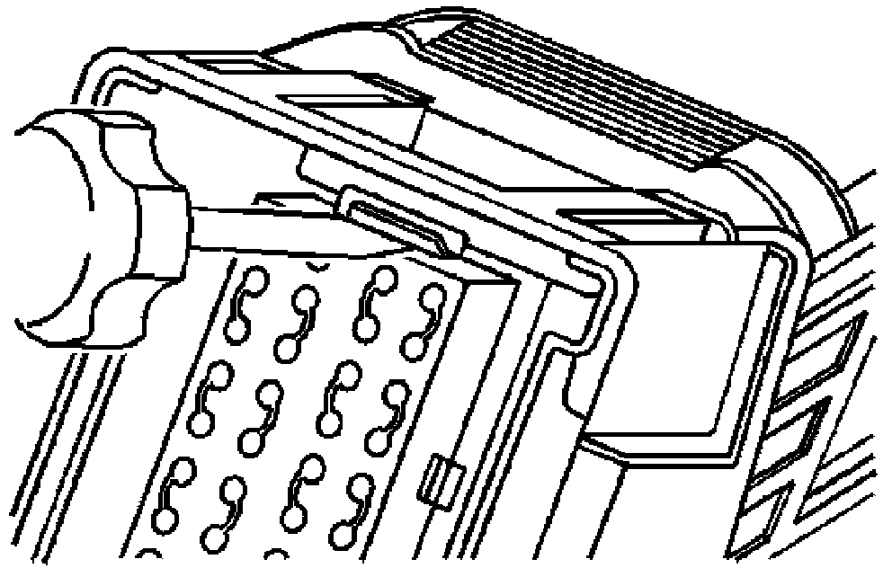 3. Locate the dress cover locking tabs at the front of the connector. Using a small flat-blade tool push down on one of the locking tabs and pull the cover up until the dress cover releases. Repeat this procedure for the other locking tab.